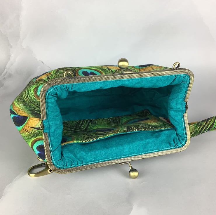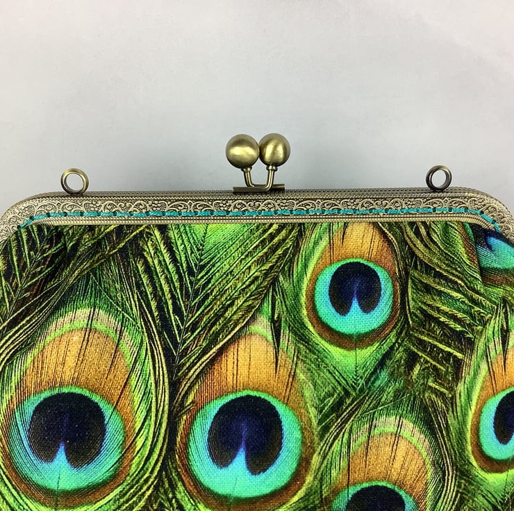Handmade clutch bag with a kiss clasp frame in a stunning turquoise and green heavy cotton fabric with overlapping peacock feather eyes