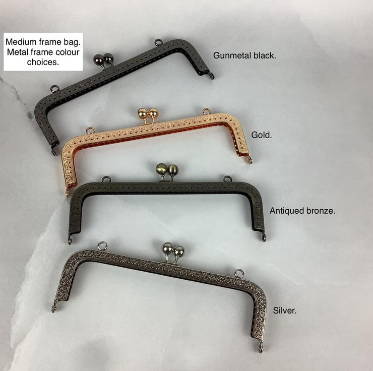 The antiqued bronze coloured metal kiss lock frame is hand stitched using thick pearl cotton thread.