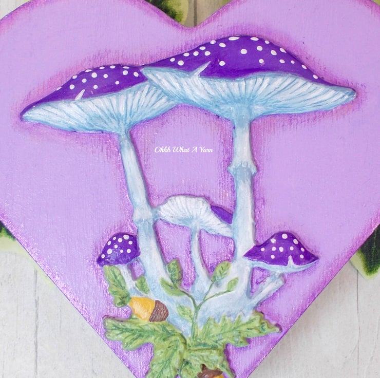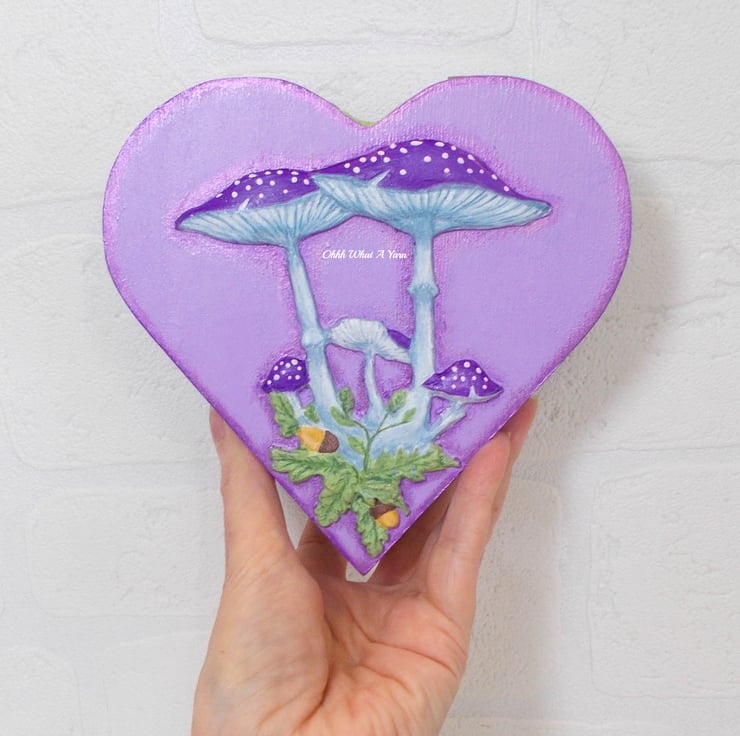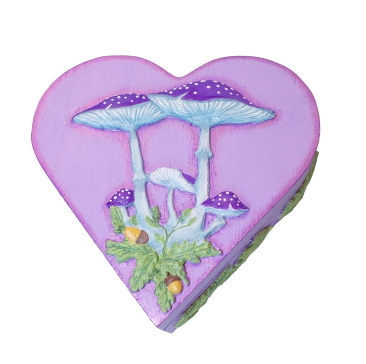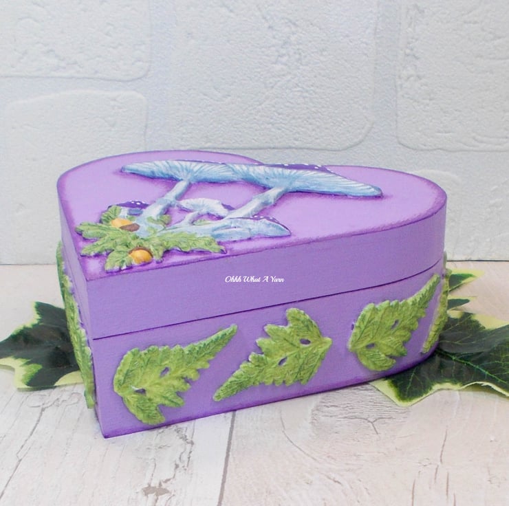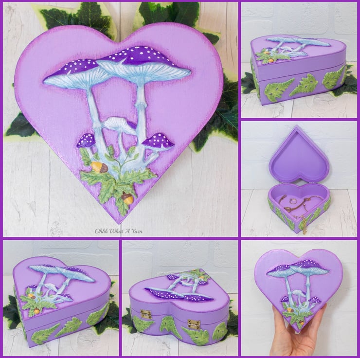This purple shroom/toadstool themed heart shaped trinket box has been created using lots of different mediums.