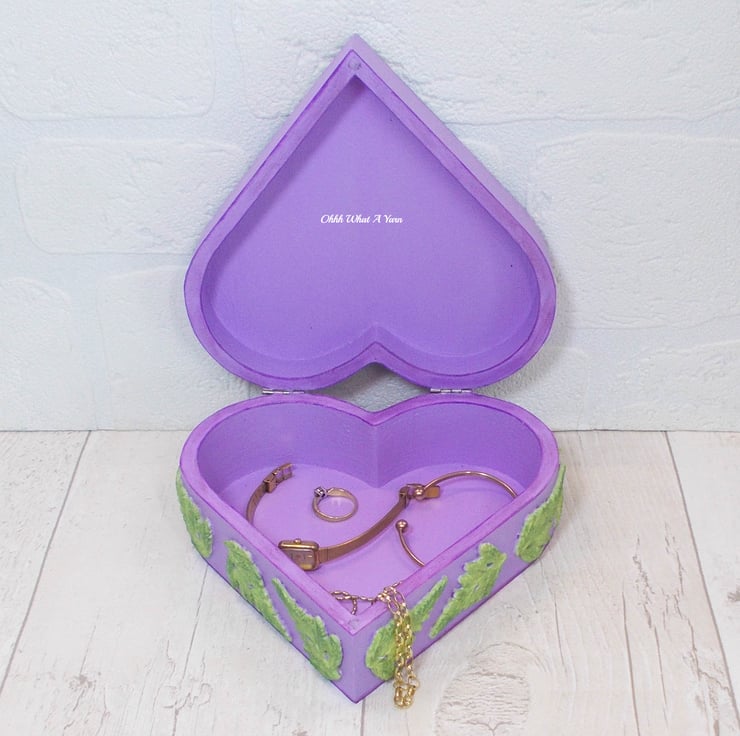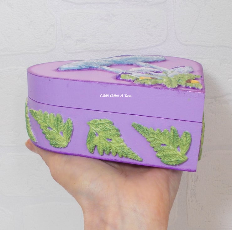 The box itself is painted using acrylic paints and I have decorated the lid with airdry clay toadstools and leaves painted with acrylic paints. I have added detailing with purple shimmery wax paste. I have also added clay fern leaves around the outside of the box.