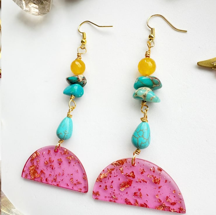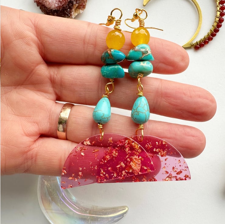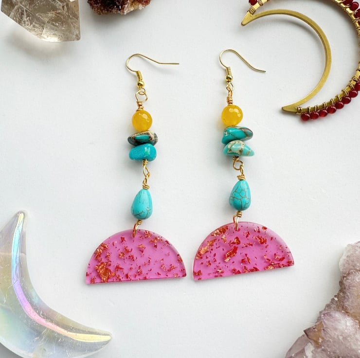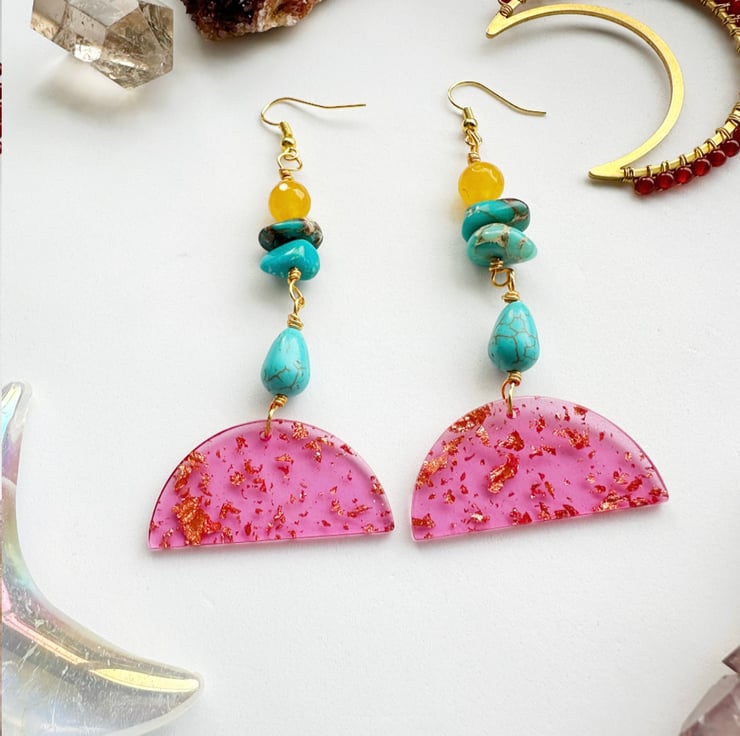 Crystal Moon earrings, Jade, Jasper,Turquoise, Acrylic Gold leaf, Pink Moon Boho