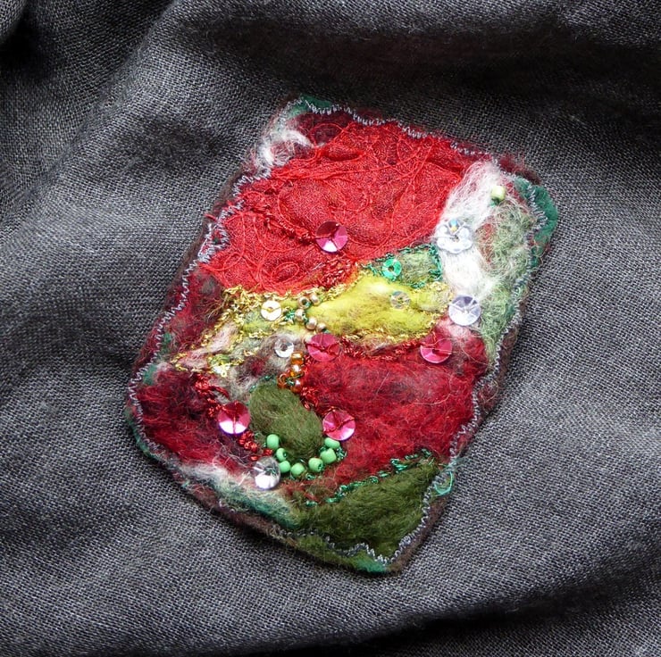 Textile felted shawl and scarf pin. Exciting wool roving colours are needle felted to form a firm base on burgundy felt with an added substantial brooch pin. Edges secured with machine embroidery. Decorated with hand embroidery using a variety of silk and metallic threads also adding stitched beads and sequins to sparkle.