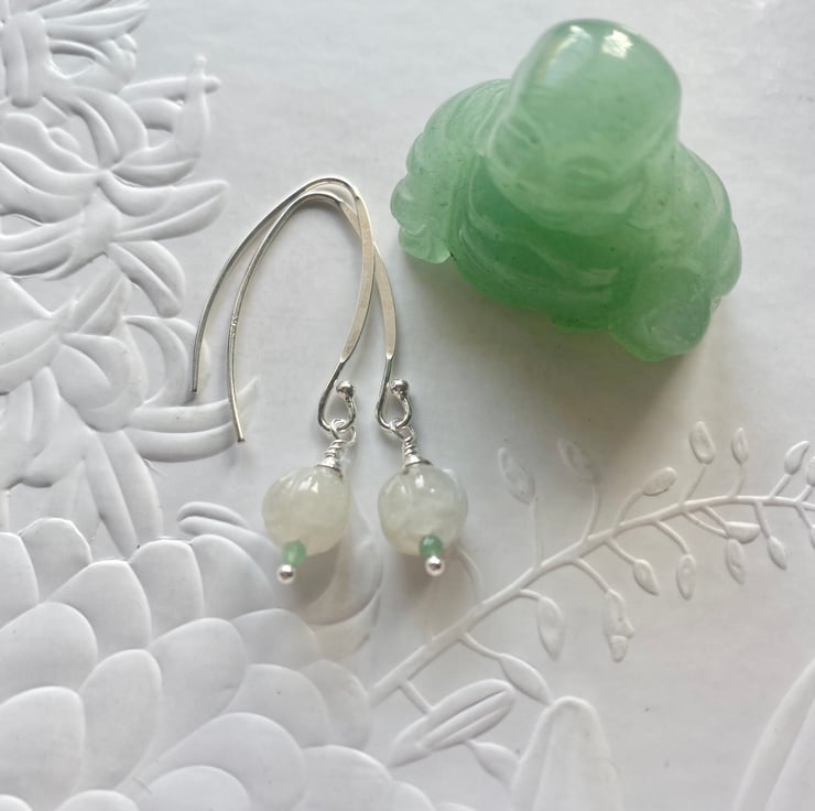 I have used Grade A natural Burmese Jadeite carved Lotus Flower beads, faceted 2mm Jadeite rounds and 925 sterling silver findings to create these lovely earrings. They are finished with sterling silver long ear wires.