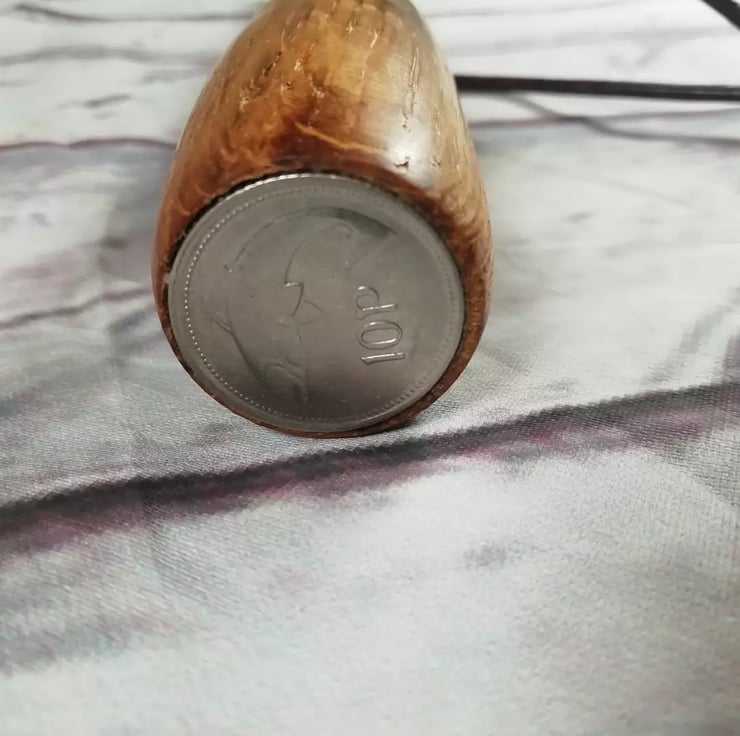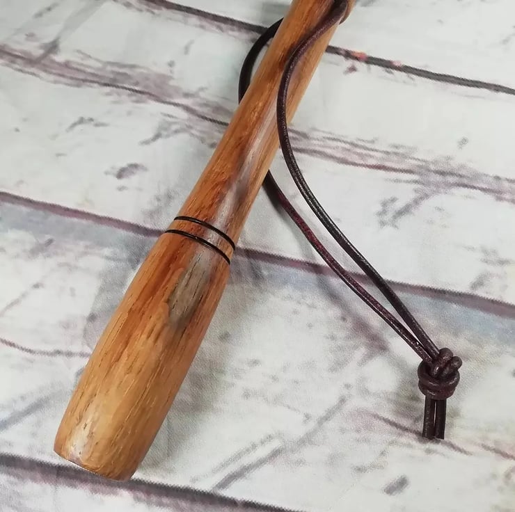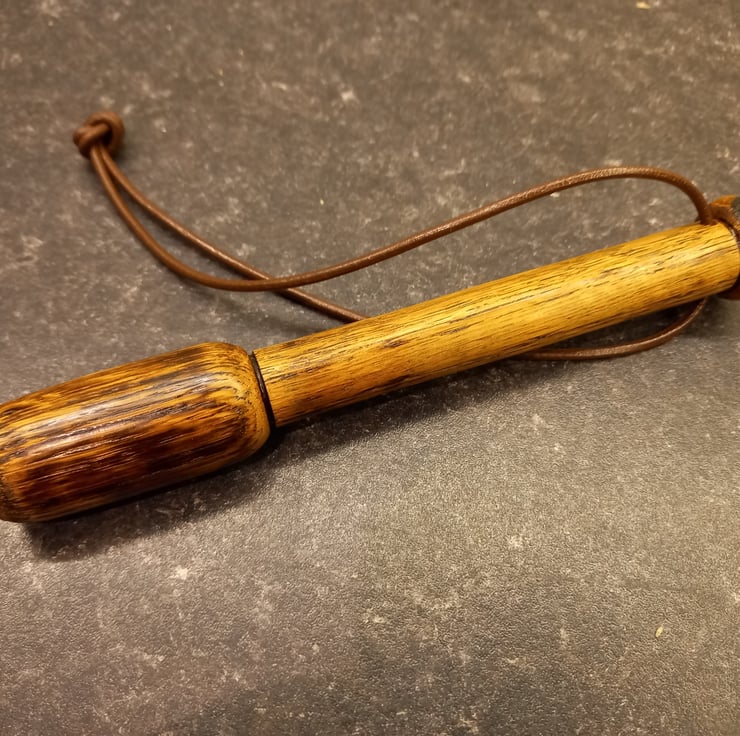 Turned on the lathe from oak sourced from Old Bushmills whiskey barrels. The priest has been weighted with lead and the end finished with an Irish 10p coin featuring a salmon. Finished with leather strap.