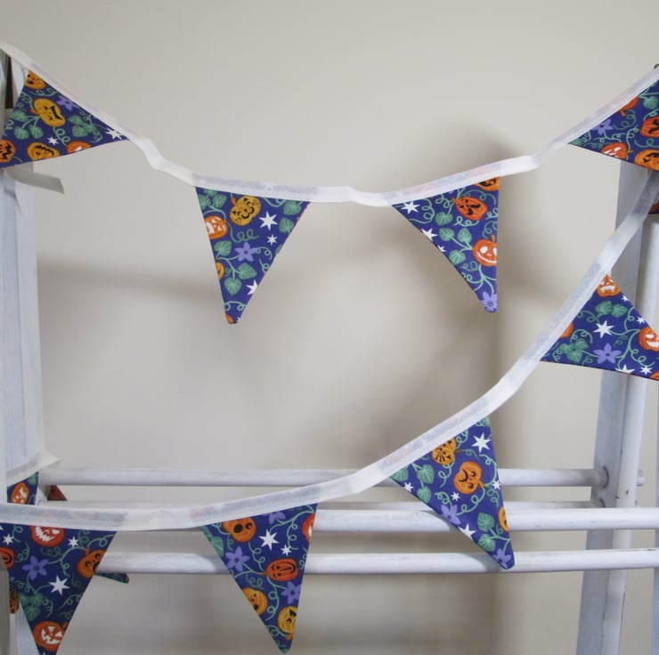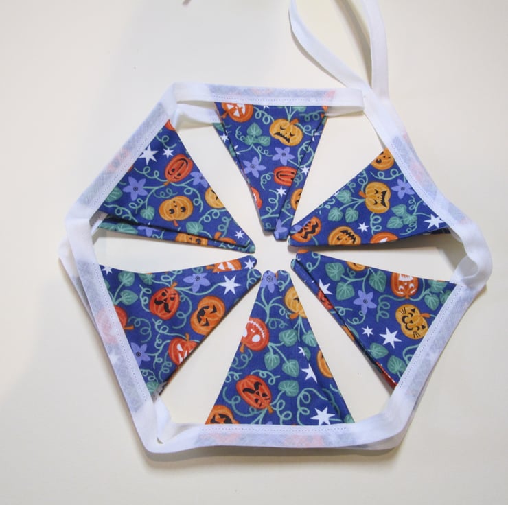 This bunting would be a beautiful addition to any home. Pennants made from 100% cotton fabric featuring a selection of smiling pumpkins with stars that glow in the dark, the same fabric is used for each side so it can be hung either way, twelve flags arranged on cream bias binding tape, with approximately 12 ins at each end to aid hanging. Pendants measure approximately three inches across and three and a half to point (7 cm x 9 cm). Overall this string of bunting measures approximately 6' 8 & 1/2 ins (2.05 m). Created in a smoke and pet free home, designed as a decoration not a toy.