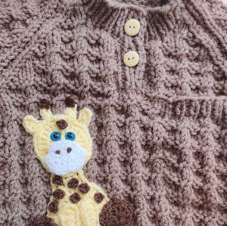 Beautiful hand crocheted cute Giraffe in gold and brown to compliment the colour of the sweater. Pattern supplied by The Yarn Conspiracy.