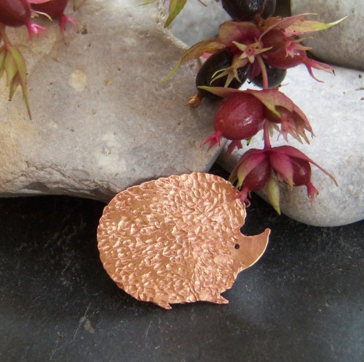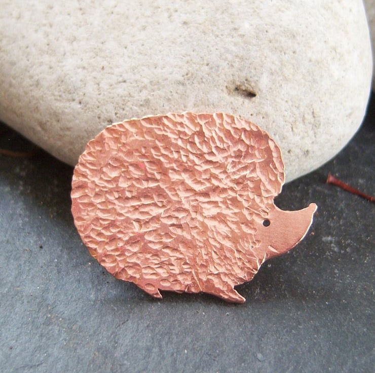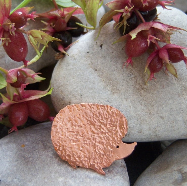 A hedgehog pierced from copper sheet and textured to represent the prickles. Sterling silver brooch fastener attached.