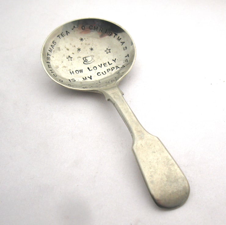 A hand stamped vintage nickel silver alloy tea caddy spoon with a 'fiddle pattern' handle and the words 'O Christmas Tea, O Christmas Tea, How Lovely Is My Cuppa' in the bowl. A lovely little Xmas gift for a tea-drinker. These short-handled spoons are very popular with hikers, bikers, campers, and other people who travel a lot and want to save weight and space - they are perfect if you need a compact, robust, easily washable spoon with a decent sized bowl, but don't want to carry around a long handle. Drop me a message if you'd like to order a custom non-Christmassy one!