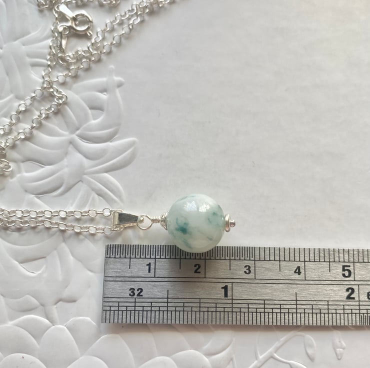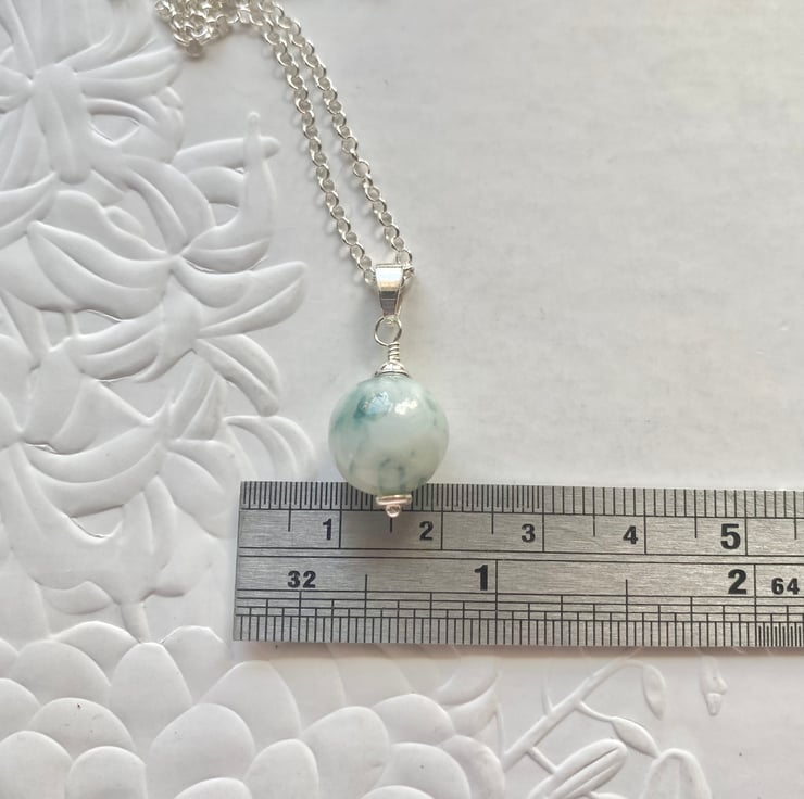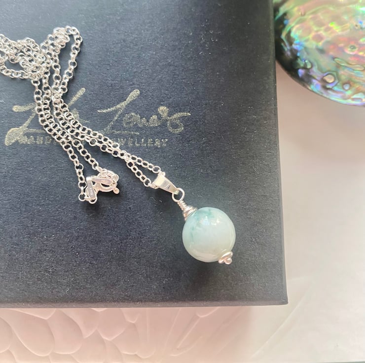 A beautiful pendant featuring a 12mm Snowflake Jade round with a 925 sterling silver bail. The pendant comes on an 18in sterling silver chain and will be received packaged in an Eco Lola Loves presentation box and I will gift wrap this for you. I can include a short message, if you are buying as a gift. Just leave the details when placing your order.