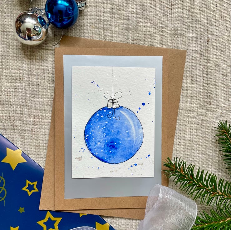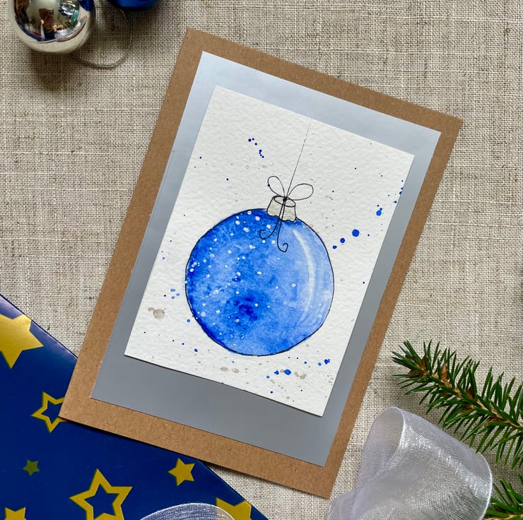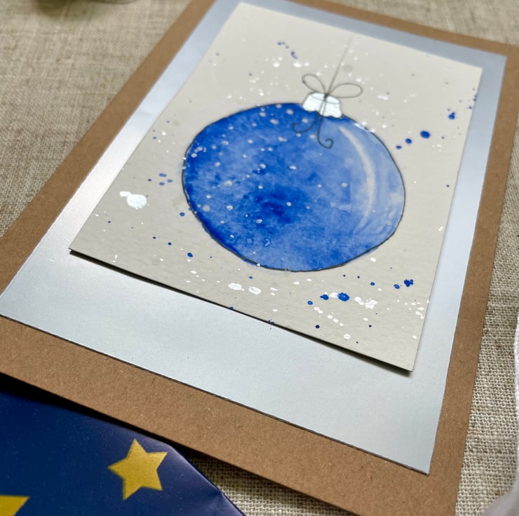 Hand painted Christmas card, one of a kind, featuring a single blue Christmas bauble painted in watercolour with a few blue and silver splatters of paint to add extra Christmas sparkle, it has then been mounted onto complimentary coloured silver card prior to being mounted onto a brown recycled card and is left blank for your own message.