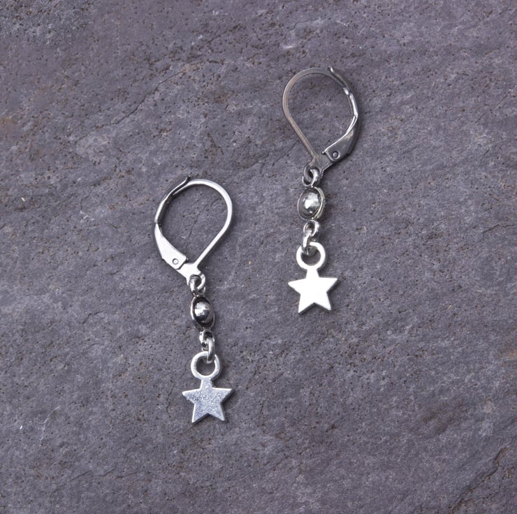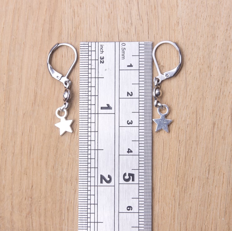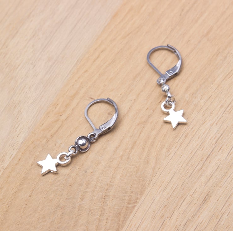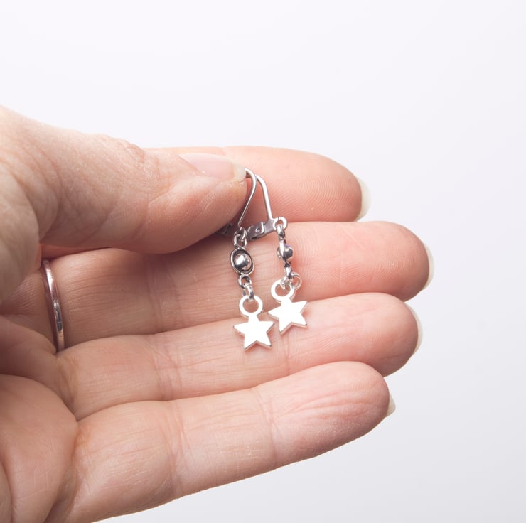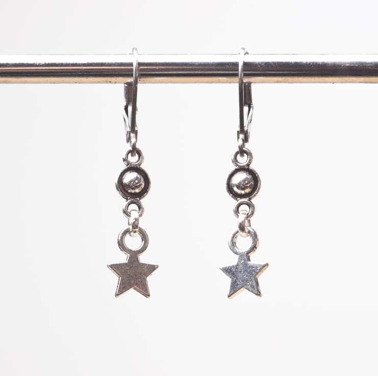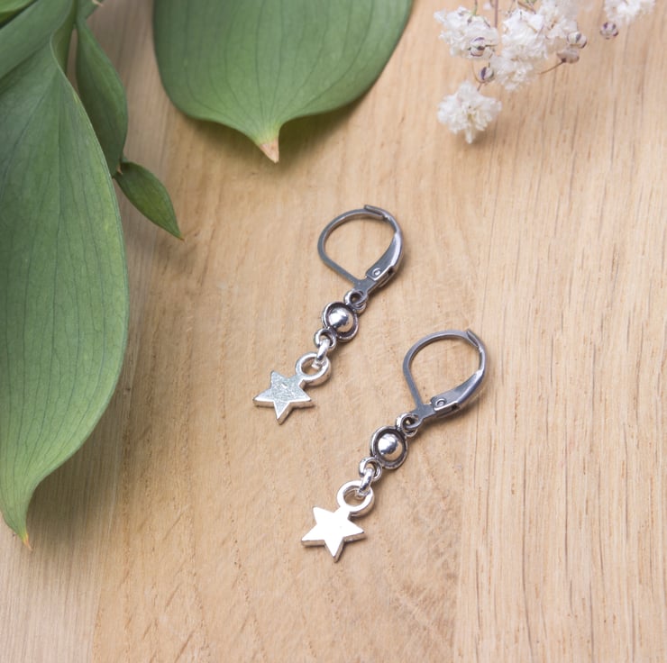 Little Star earrings - beautiful Tibetan silver dangle earrings featuring cute little silver-tone stars that hang from 'ball-in-circle' detail links. These earrings are perfect for everyday wear and measure almost 3cms in length, including the stainless steel lever-back ear fittings.