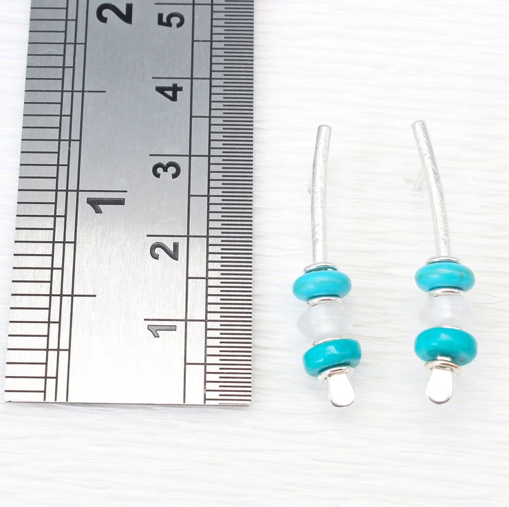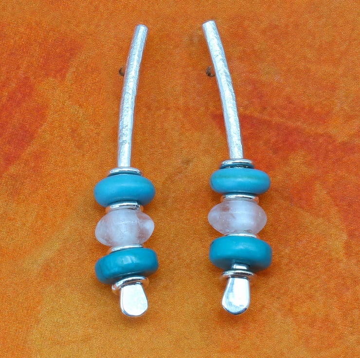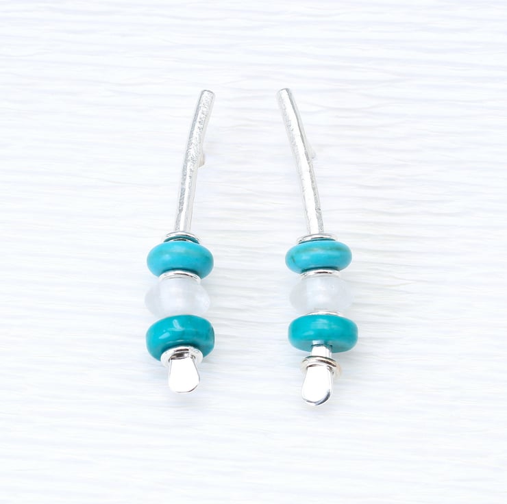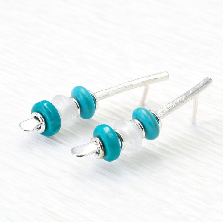 These elegant earrings have been designed and handmade by us in our workshop in Yorkshire. They are made from sterling silver and on each silver earring rod hangs three 6mm stones, two turquoise and one rock crystal, which are interspersed with small silver hoops. These earrings are slightly curved to complement the shape of the wearer's face and come in one of our branded gift boxes.