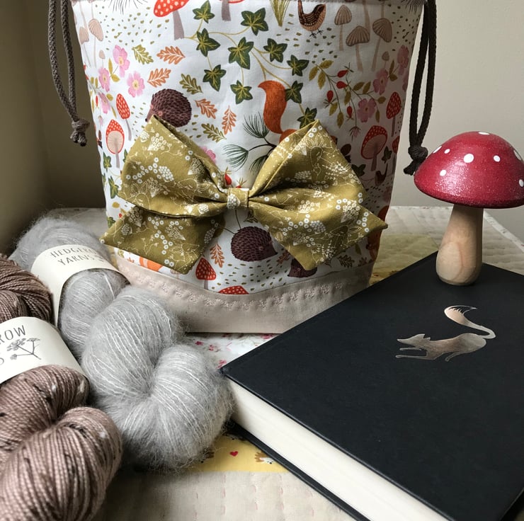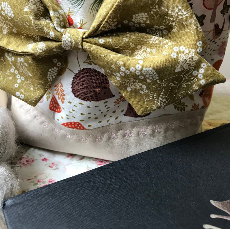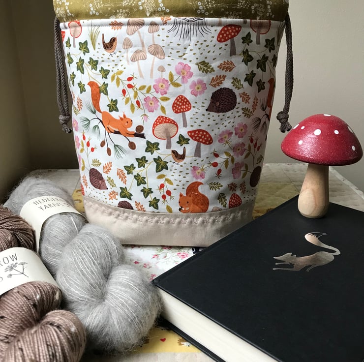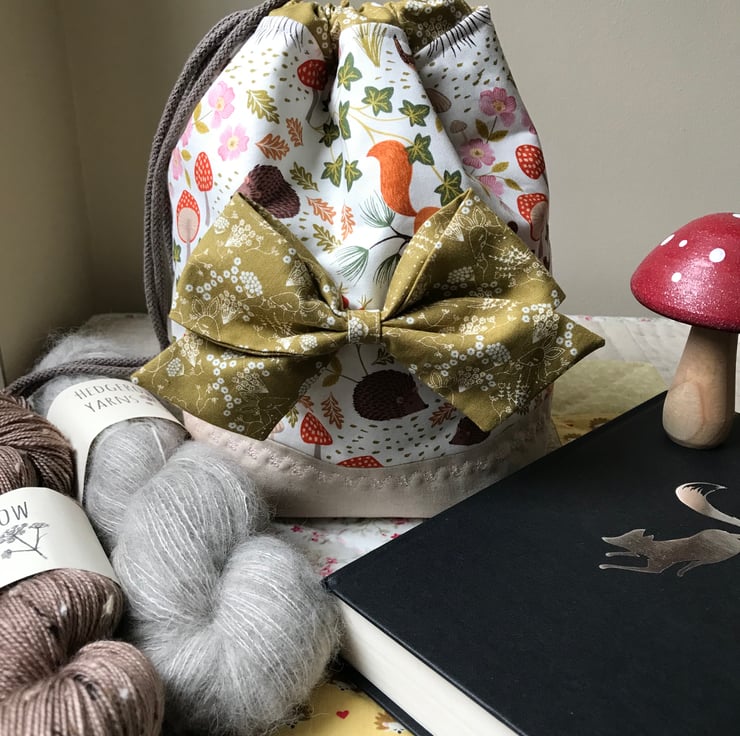 I have made a project bag out of beautiful autumn animal cotton and stitched it together with some lovely natural linen.