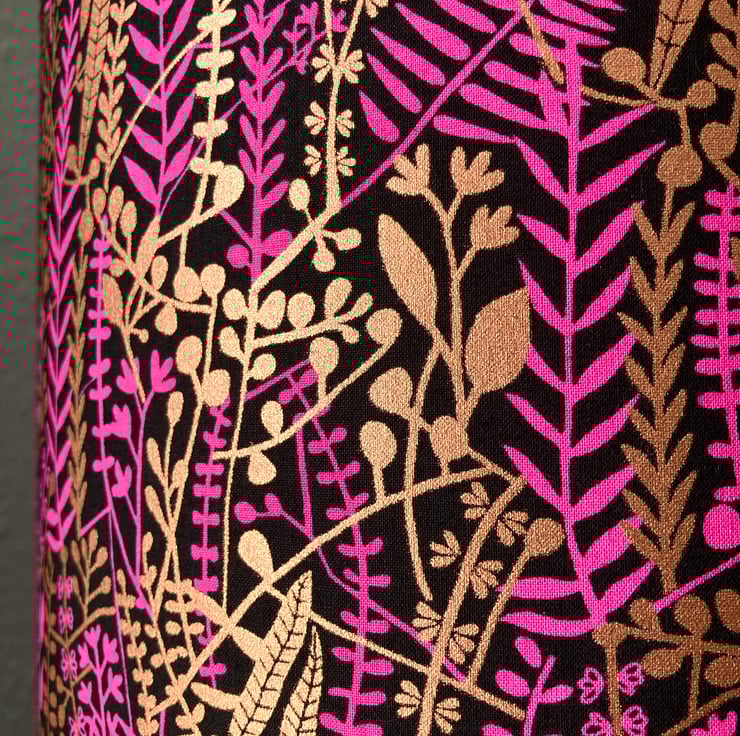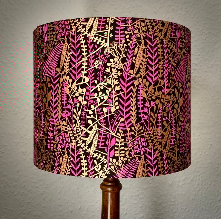 Handmade 25cm diameter shade featuring bright pink and metallic copper silhouettes of wild plants and grasses on a black background. (Don't be put off by the dark background, it lets through just as much light as a lighter coloured shade.)