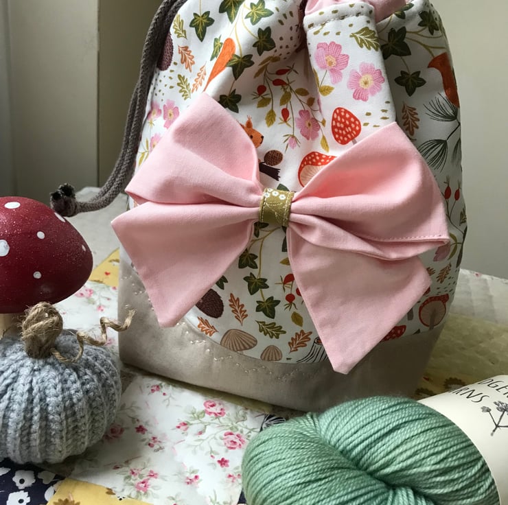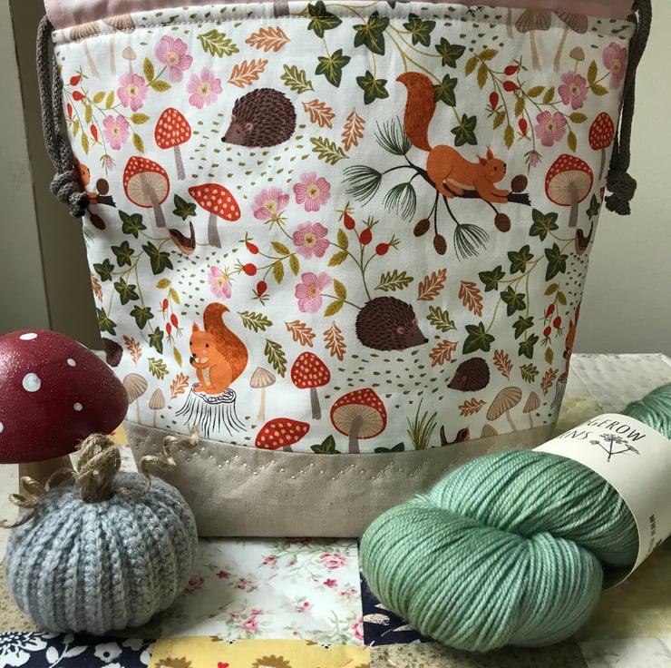 I have made a project bag out of beautiful autumn animal cotton and stitched it together with some lovely natural linen.