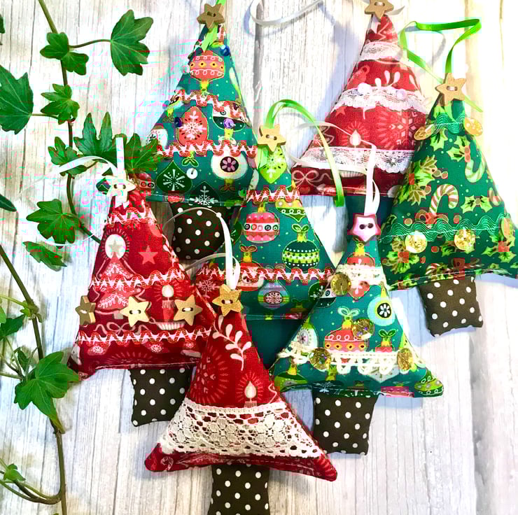 Handmade Christmas tree decoration. Made from lovely Christmas patterned fabric and then decorated with ric rac and buttons. Lightly stuffed. Topped off with a gold wooden star shaped button. Ribbon loop for hanging.