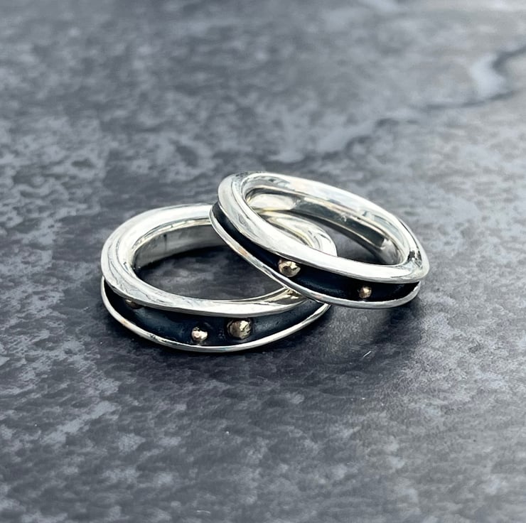 This freeform stack ring is made from Sterling Silver and is part oxidised. It also has real 9ct yellow gold balls around the two rings. The two rings sit together and give the feel and appearance of undulating waves.