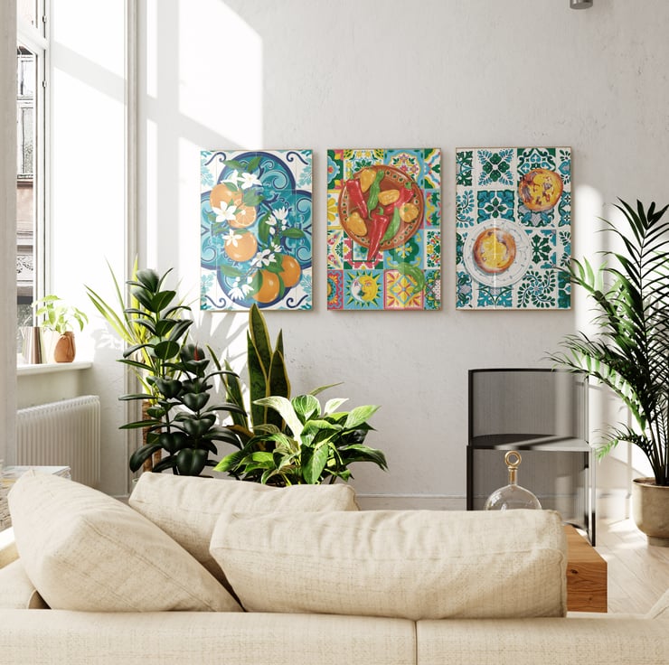 Hot and spicy Mexican chilli peppers over traditional Mexican talavera tiles. This bright art print will bring colour and fun into any kitchen. The perfect wall art for a foodie or Mexico enthusiast.