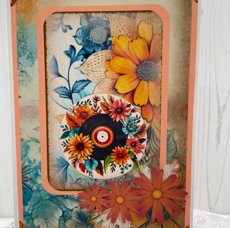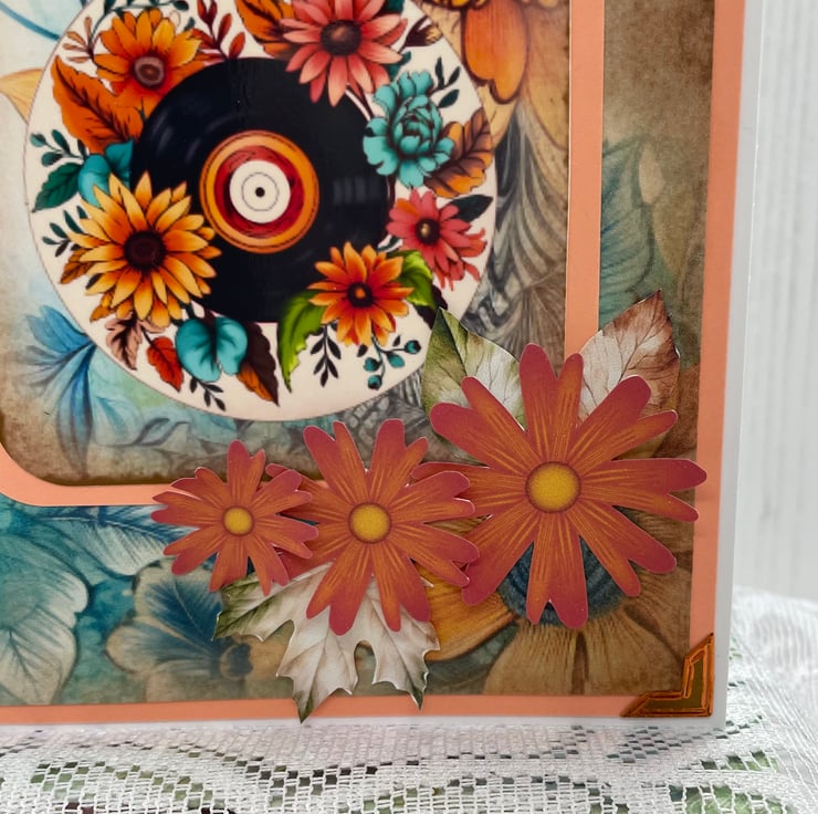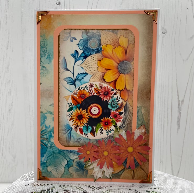 White 5 x 7” card and envelope with a peach layering mat, topped with a pretty 60’s style backing paper. Peach layering mat topped with a photo hippy style image. Hand it flowers and leaves to embellish. From an era when life was simpler, no computers or mobile phones just listening to music at maybe Woodstock. All in the colours of Autumn. The inner page has been left for your own message.