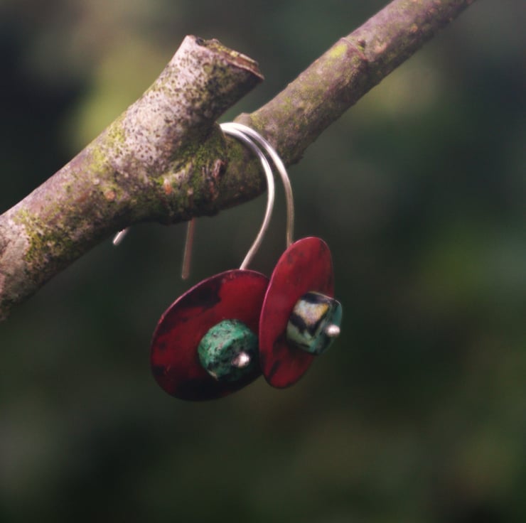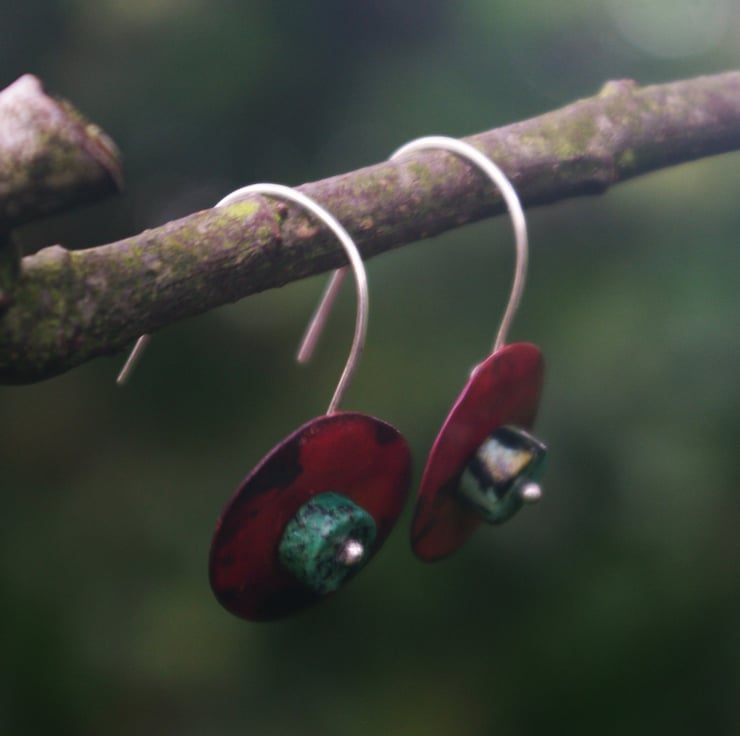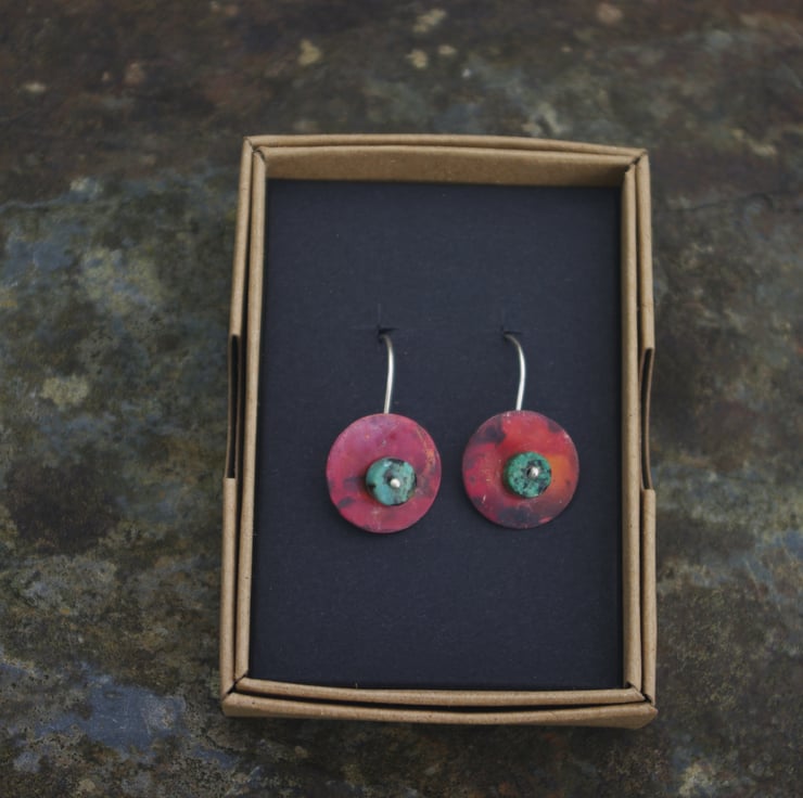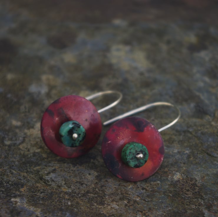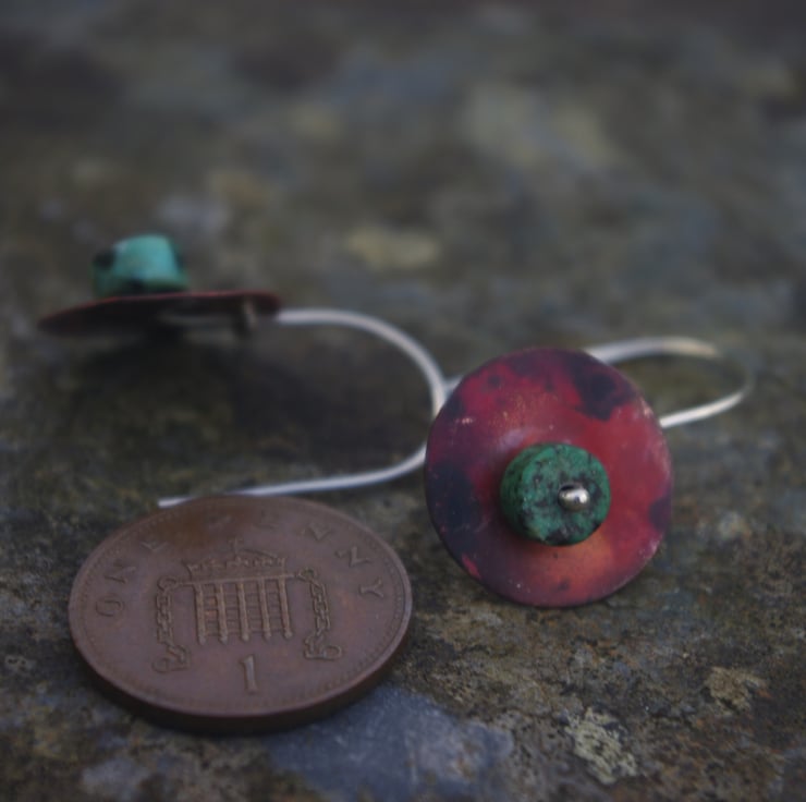 Copper circles with an Amazonite bead, making a simple but colourful pair of contemporary earrings . The luscious red tones of the copper , achieved with heat ,contrast really well with the turquoise blue of the Amazonite. The bead is secured to the front of the brass by a silver blob on the end of the ear hook .