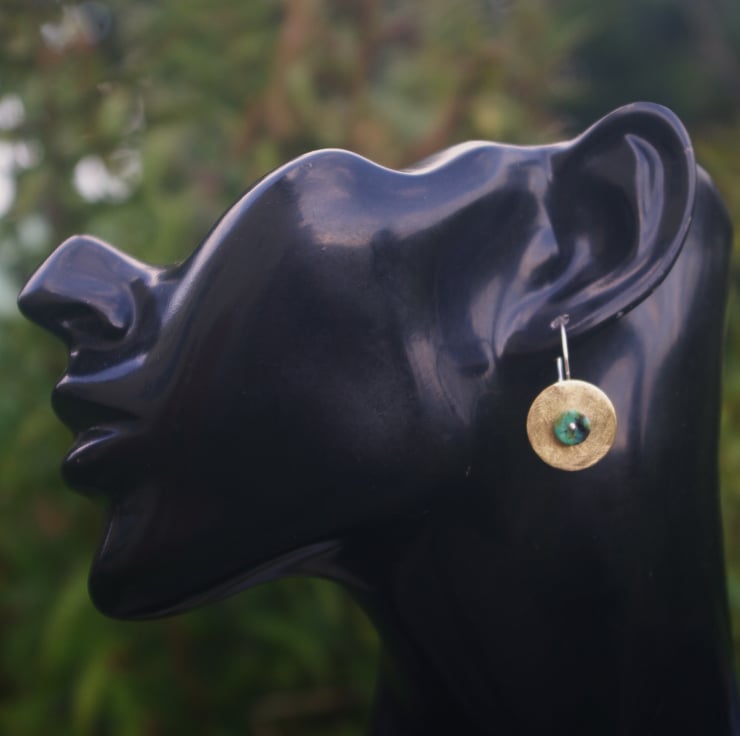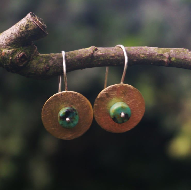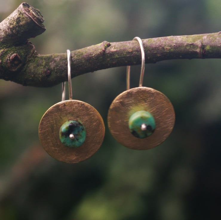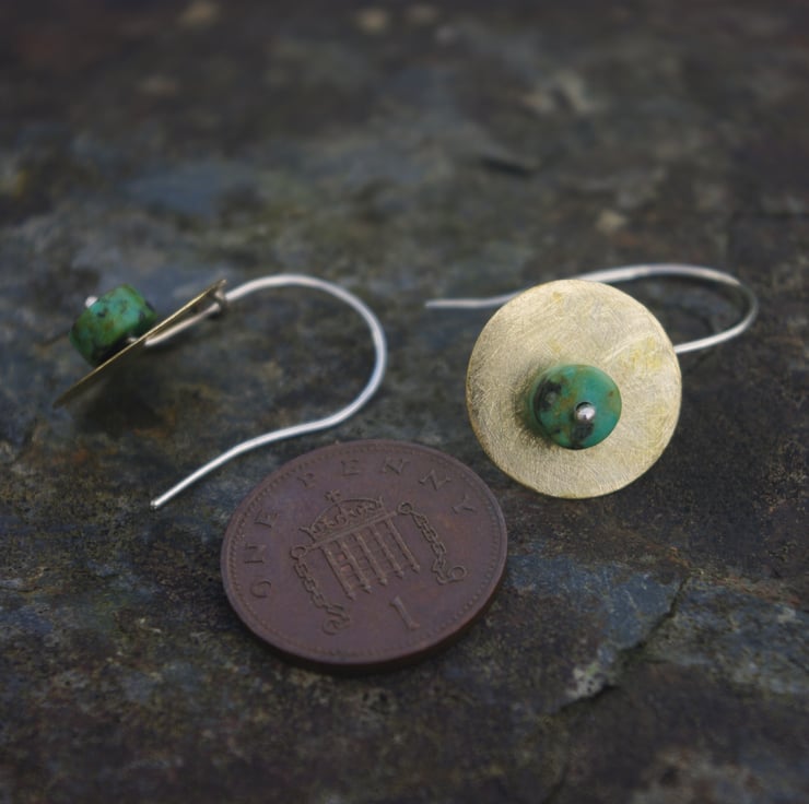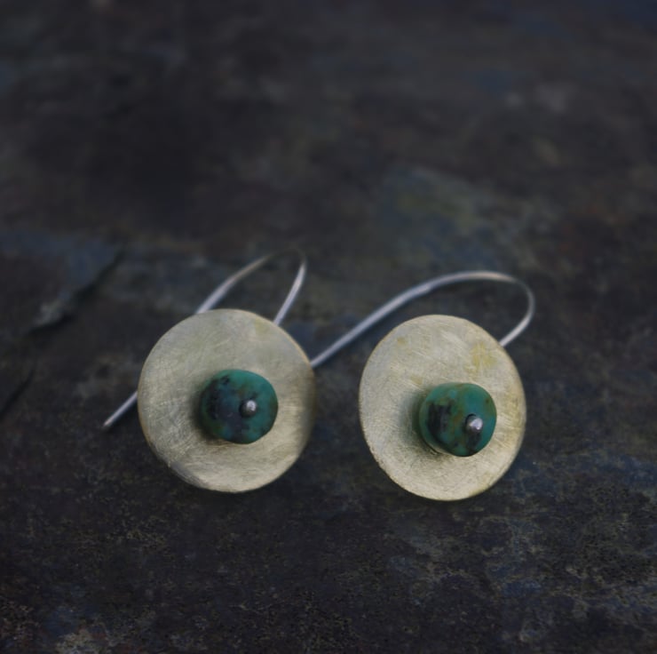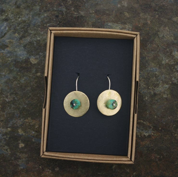 Brass circles with an Amazonite bead, making a simple but colourful pair of contemporary earrings . The golden yellow of the brass , which has a frosted texture, contrasts well with the turquoise blue of the Amazonite bead . This is secured to the front of the brass by a silver blob on the end of the ear hook .