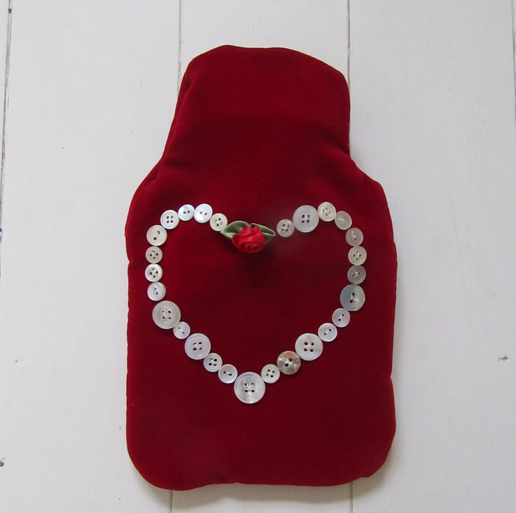 A beautiful red velvet hot water bottle cover, lined with a red and white check cotton fabric. On the front I have hand sewn a 'heart of buttons' with a ribbon rose in the center. There is an envelope style opening at the back where the hot water bottle can be topped up. There is plenty of room for the 500ml hot water bottle.
