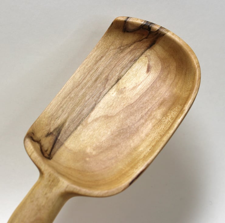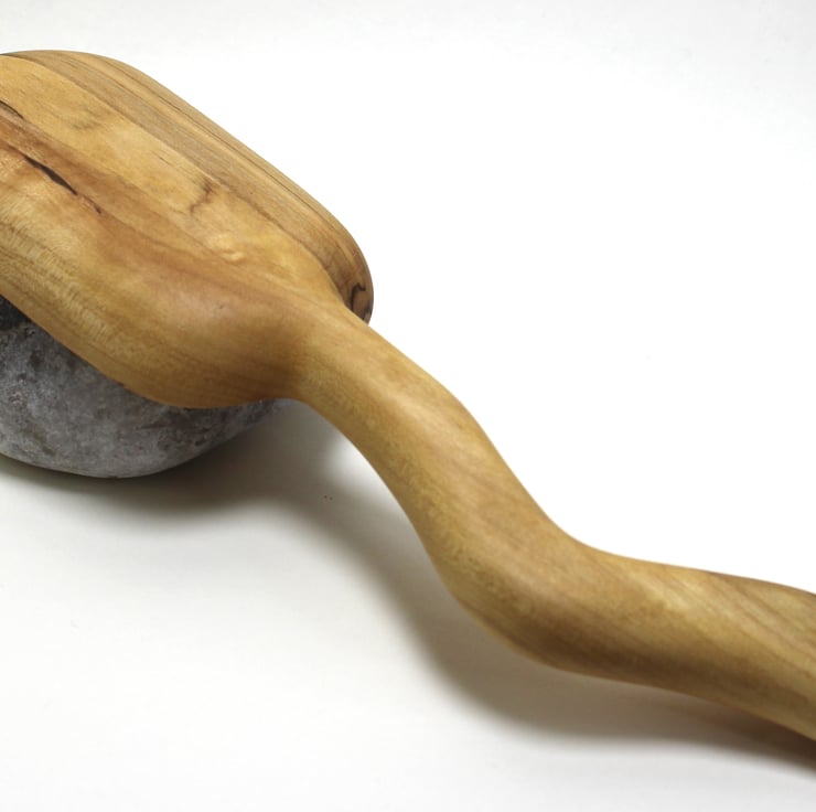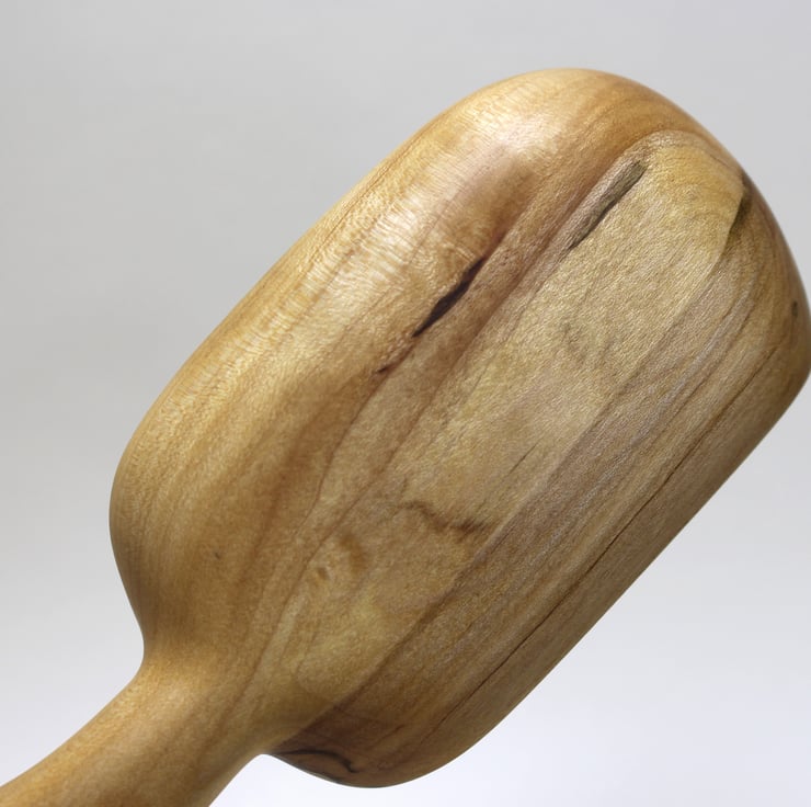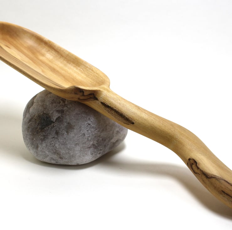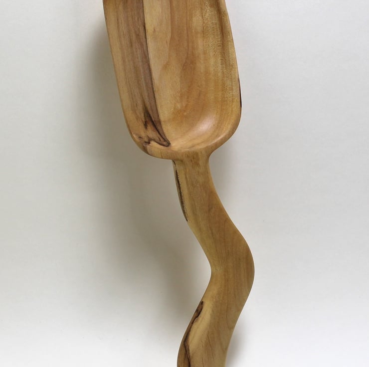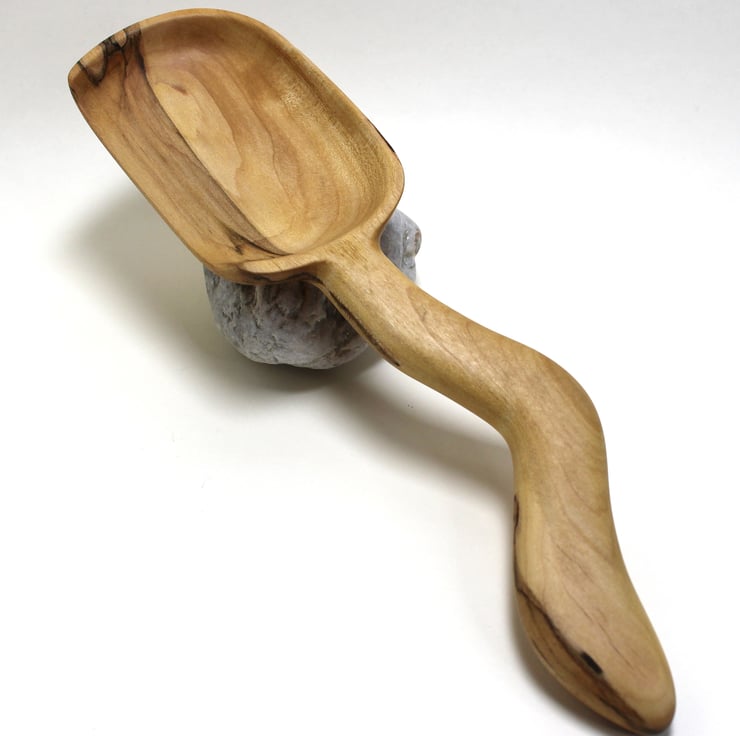 A wooden kitchen utensil that has been carved and finshed by hand from a piece of an old pallet. It is excellent for cooking and serving food.The wood appears to be elm and I've chemically treated it to make it completely food safe. It should however not be placed in a dishwasher. I made the handle (which is surprisingly comfortable) wavy to keep as much length as possible as it had to be carved around screw holes. It would have been a shame to let this piece of wood go to waste. It has such beautiful colouring and a the tight grain of high quality, sturdy wood.