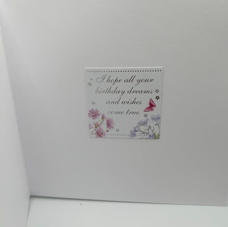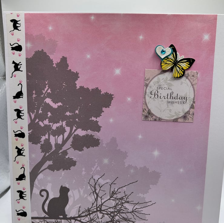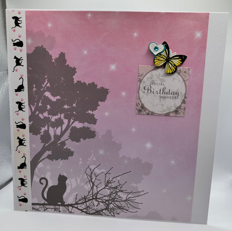 This card is so cute it is 8x8inches white with a pink background and a black cat watching the butterfly in the top corner. There is also black cats going down at the left side. inside is a lovely little verse. I m sure any cat lover would like this card for their birthday. I ve made cards for many years now and I find it a great help to craft when I m up through the night unable to sleep as I have fibromyalgia and crafting distracts me from everything that comes with fibro. it gives me great satisfaction if someone buys my cards !