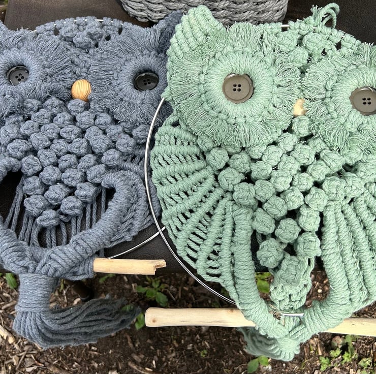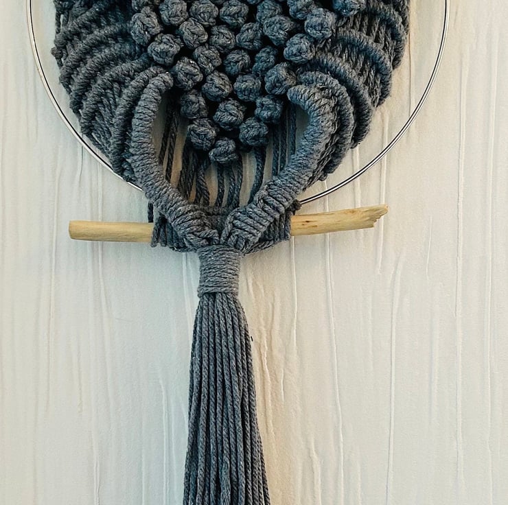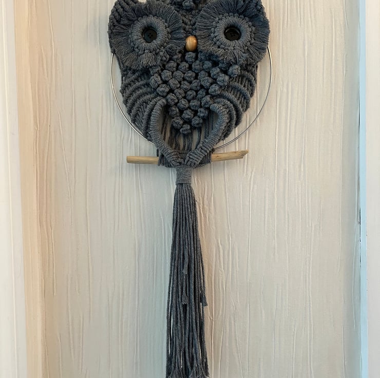 How cute is this? A lovely owl all done using macrame cord . The one shown is in grey but any colour can be ordered . Approximately 25cms diameter (without the tail) and will look lovely hanging on the wall. Will fit with most decor. Made by myself I really enjoyed making this . Owls are a favourite of many people and I can see why. it would make a lovely present for someone. the wise owl maybe a gift for a person very knowledgeable? .It would look lovely hanging in any room or office.