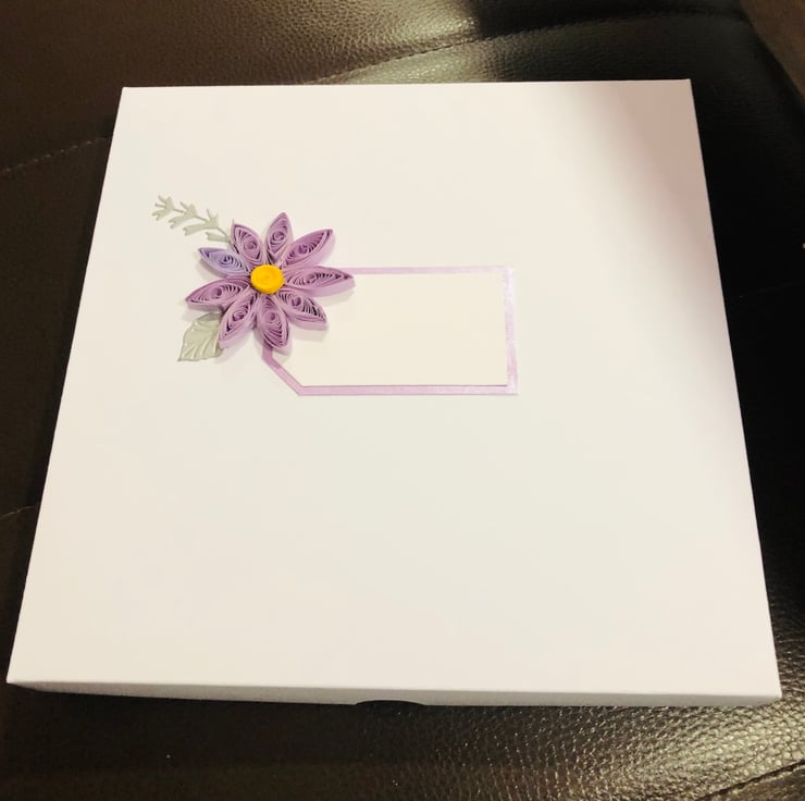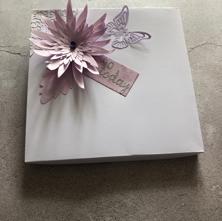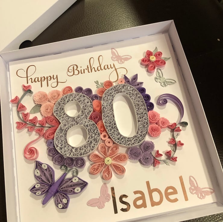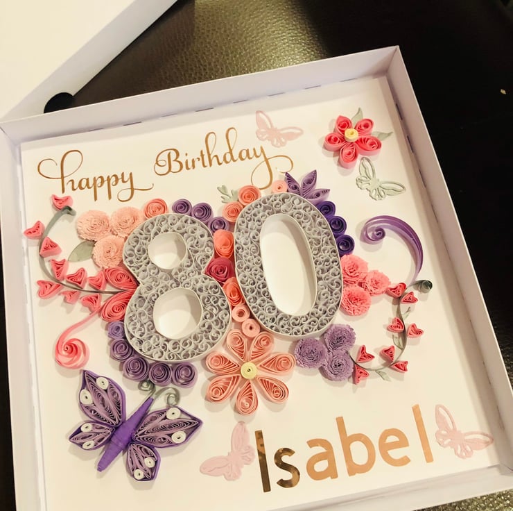 For a special birthday, wedding,engagement or anniversary a Beautiful white card full of quilled flowers , and a quilled number of your choice. also for wedding or engagements I can do hearts filled with flowers and in the wedding colours. This particular card was made for 80th birthday and the recipient was in tears she was so pleased with it . Also inside there is a lovely verse and cut out butterflies . It s such a special card to receive . This is a unique card as it s impossible to make two identical cards. It will come in a box and the card inside will be wrapped in tissue paper. You can choose your colours as well. Please give plenty of time from ordering as it is made to order and takes 2 weeks . I will contact you when you place an order to discuss colours the occasion any special requests etc. The card itself is 8x8 inches and the box is the same.