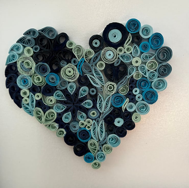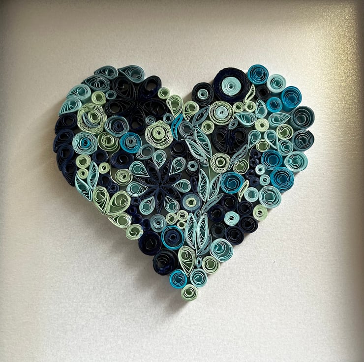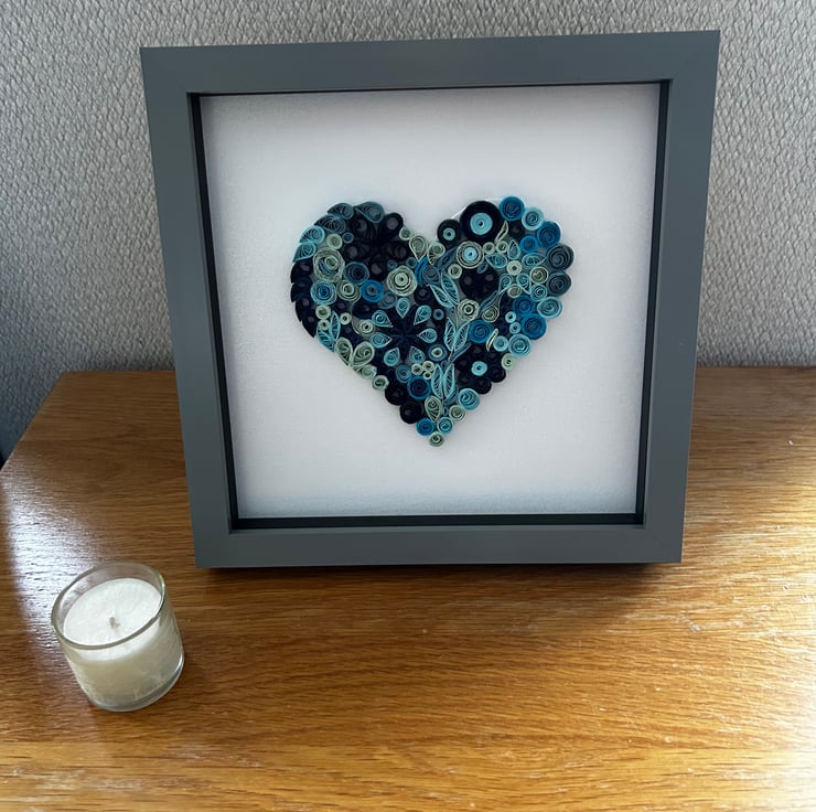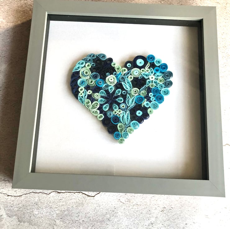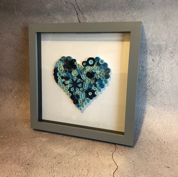Blue shades of quilled pieces in the shape of a heart set in a grey 8x8 inch frame. Lots of occasions when this would be a lovely present engagement, wedding , friends birthday any special day really and all handmade by myself. I can also do this to order in different colours. I am able to personalise this with two names or a date depending on length of names. as this is made from paper it may fade eventually if place in direct sunlight so please be aware of this when hanging or standing. quilling is a form of paper art using strips of paper and curled into shapes to make pictures. This is an example of what colours you can have. However this is done to order and will take 2-3 weeks to complete and frame . Once ordered I will contact you to discuss colours and time etc