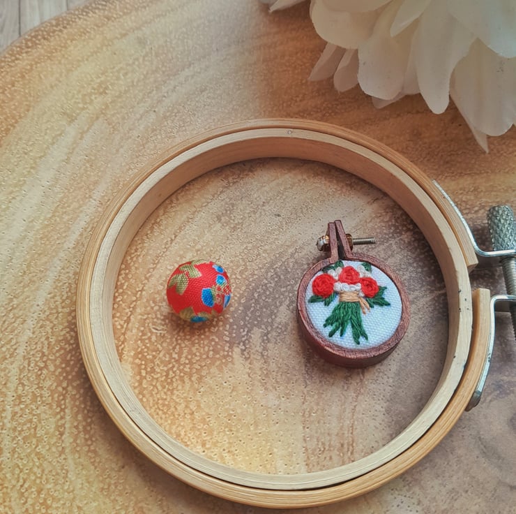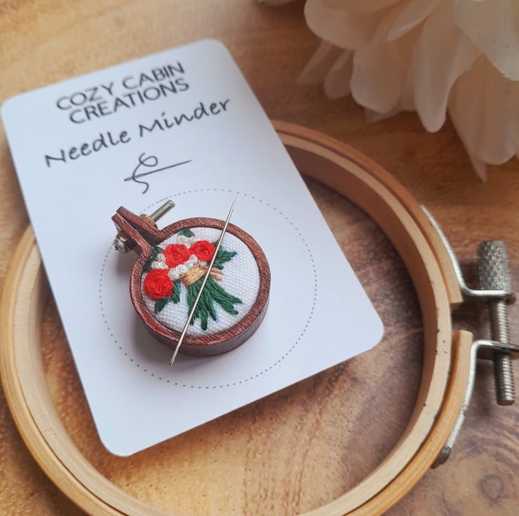 Sweet little embroidered rose mini hoop needle minder is a must have for any sewing or embroidery enthusiast.