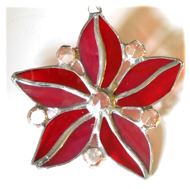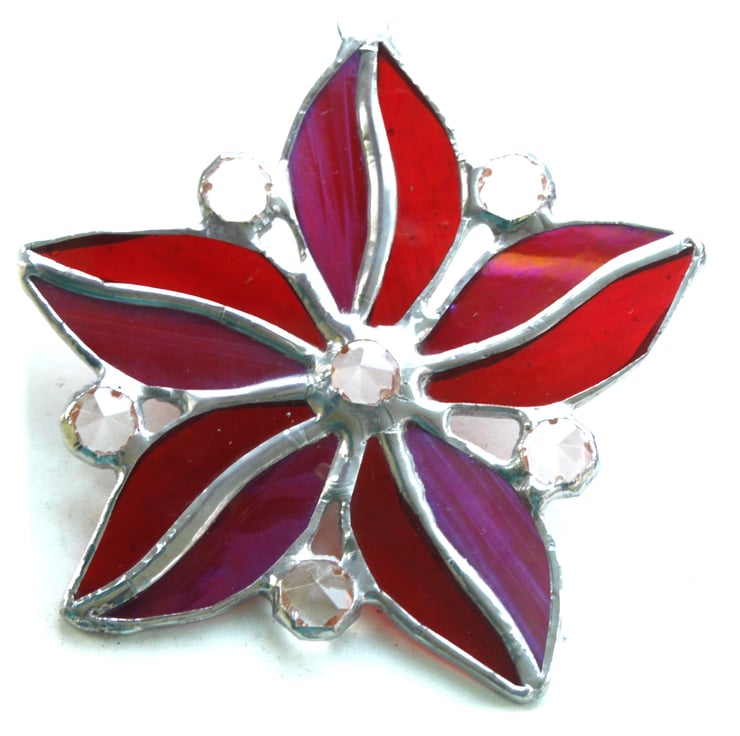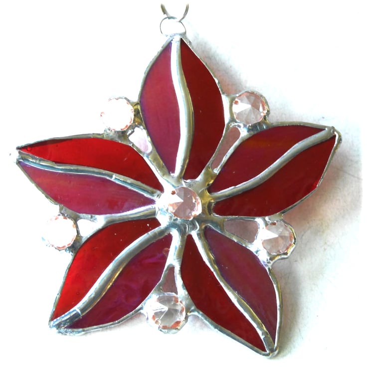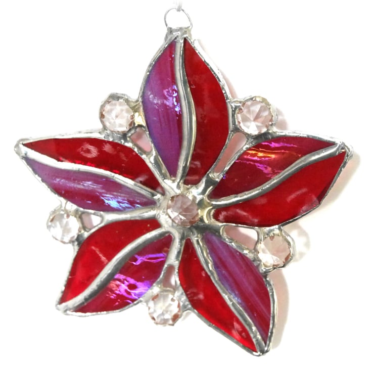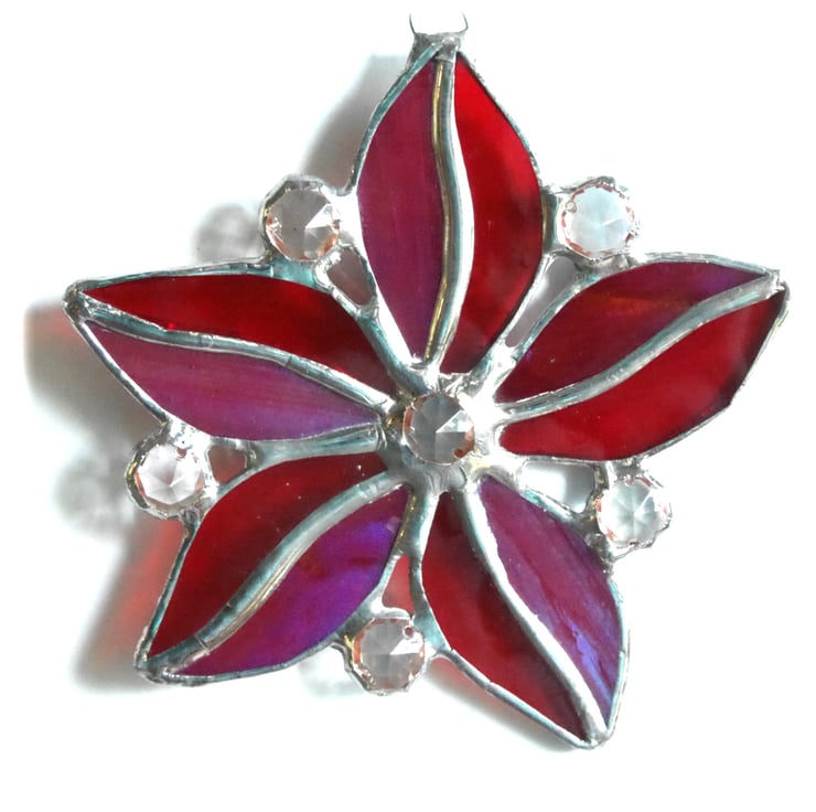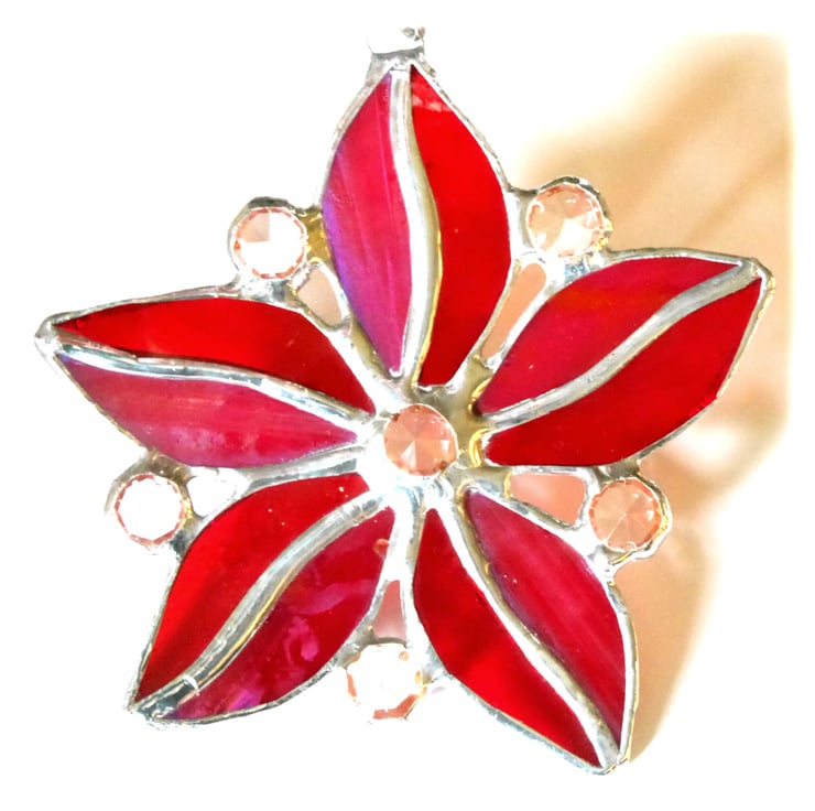 It is a gorgeous star shaped 5 petal flower with each petal split into 2. One side an iridescent red, the other a slightly streaky textured. Between each petal I've soldered a multifaceted little twinkly chandelier crystal and there's one in the centre of the flower as well.