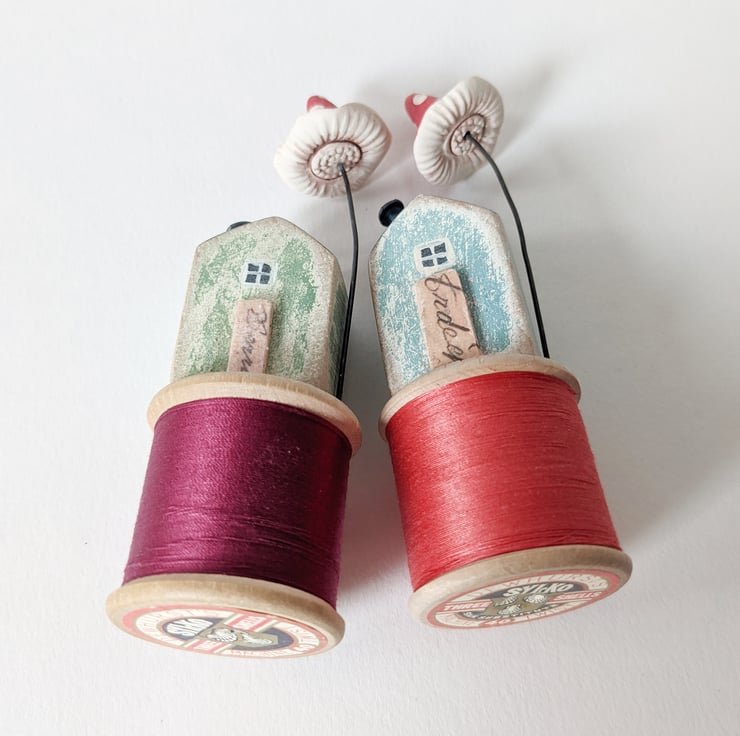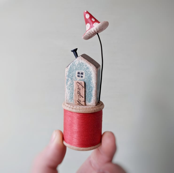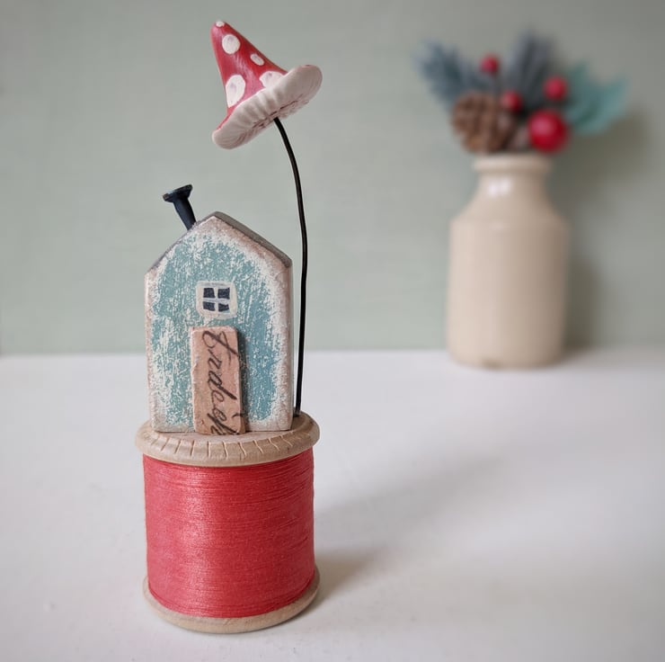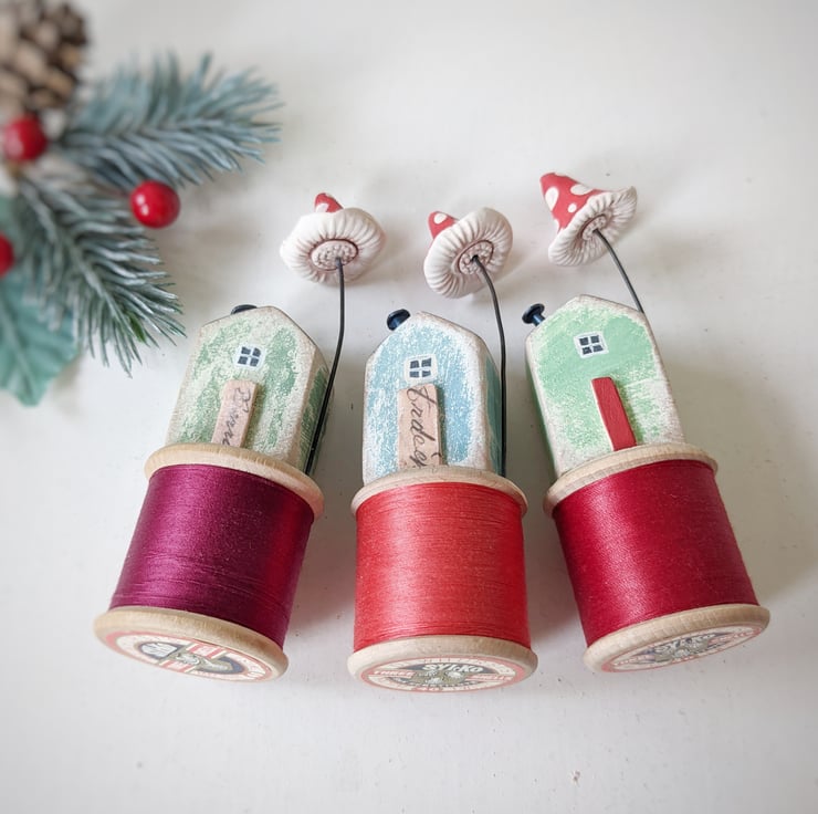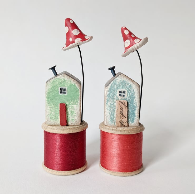 I love finding these old bobbins on rummaging trips! The tiny homes perch happily on top.