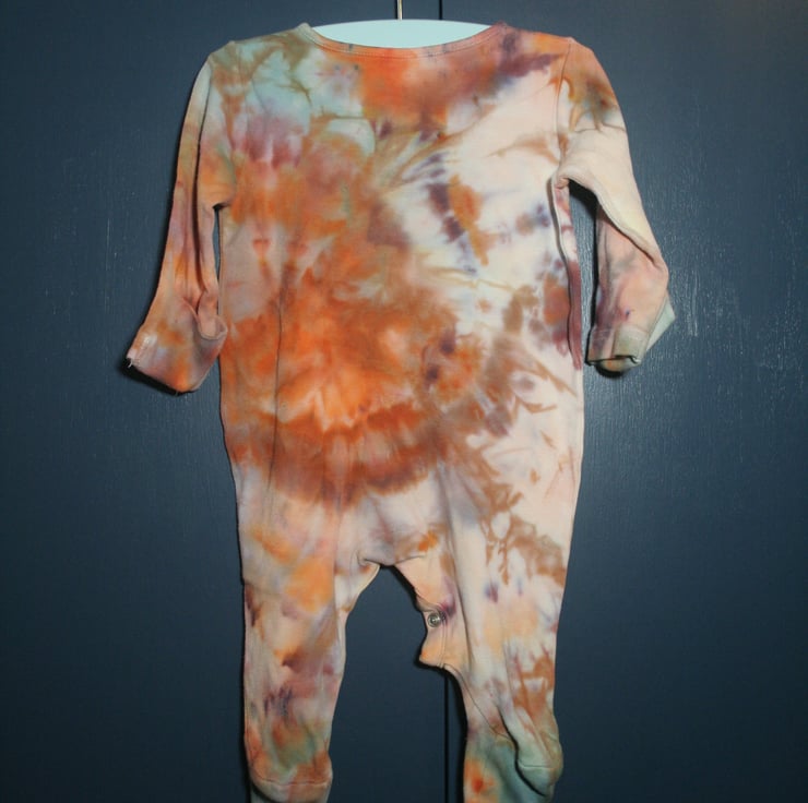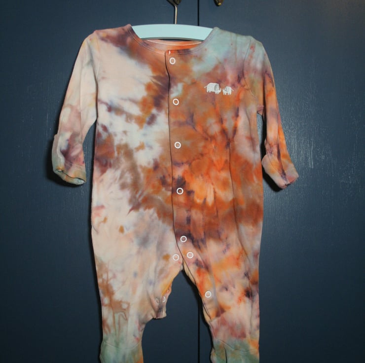 Burnt Orange & Blue colours used to create a beautiful soft swirl effect. The ice-dye has highlighted out the little embroidered elephants on the breast. 1-3 months / up to 14.5 lbs. This is a second chance item.