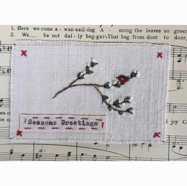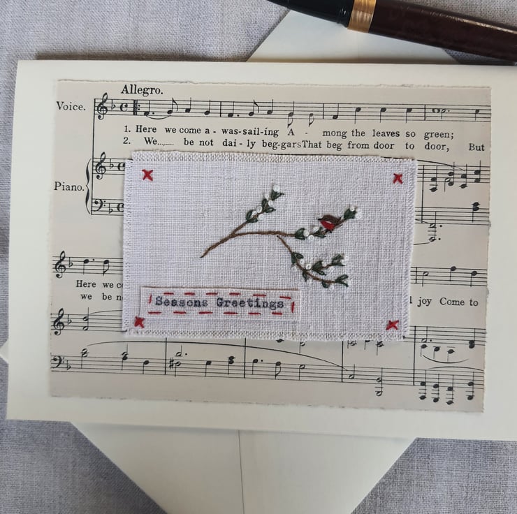 More than a card! Hand embroidered on vintage linen and mounted on a piece of vintage sheet music on a blank card for your own message. Ideal for when you want to give more than a card as this beautiful card can be framed afterwards.