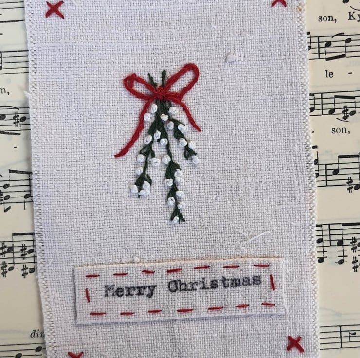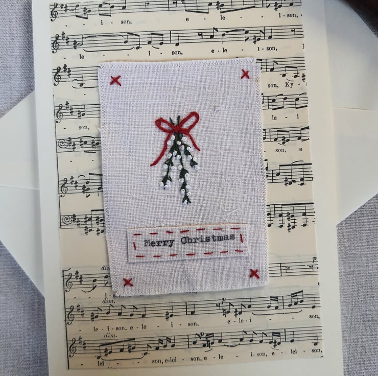More than a card! Hand embroidered on vintage linen and mounted on a piece of vintage sheet music on a blank card for your own message. Ideal for when you want to give more than a card as this beautiful card can be framed afterwards.