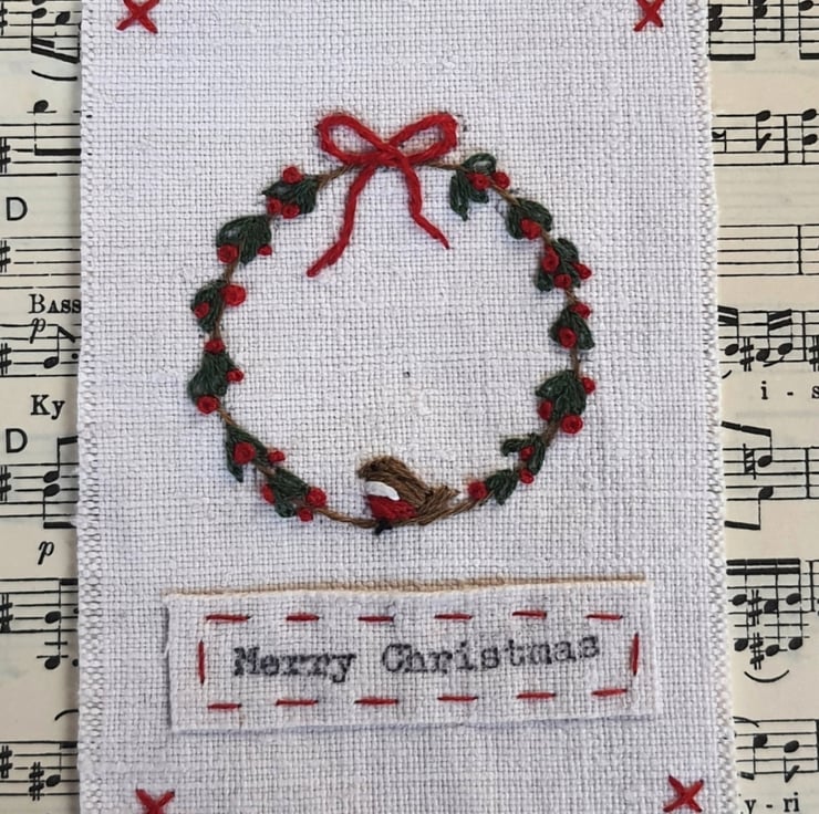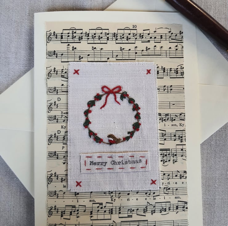 More than a card! Hand embroidered on vintage linen and mounted on a piece of vintage sheet music on a blank card for your own message. Ideal for when you want to give more than a card as this beautiful card can be framed afterwards.