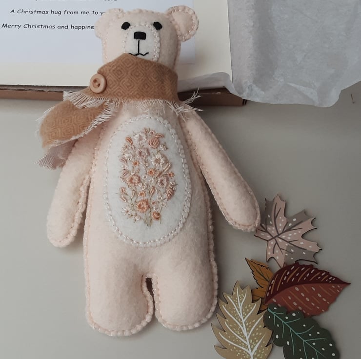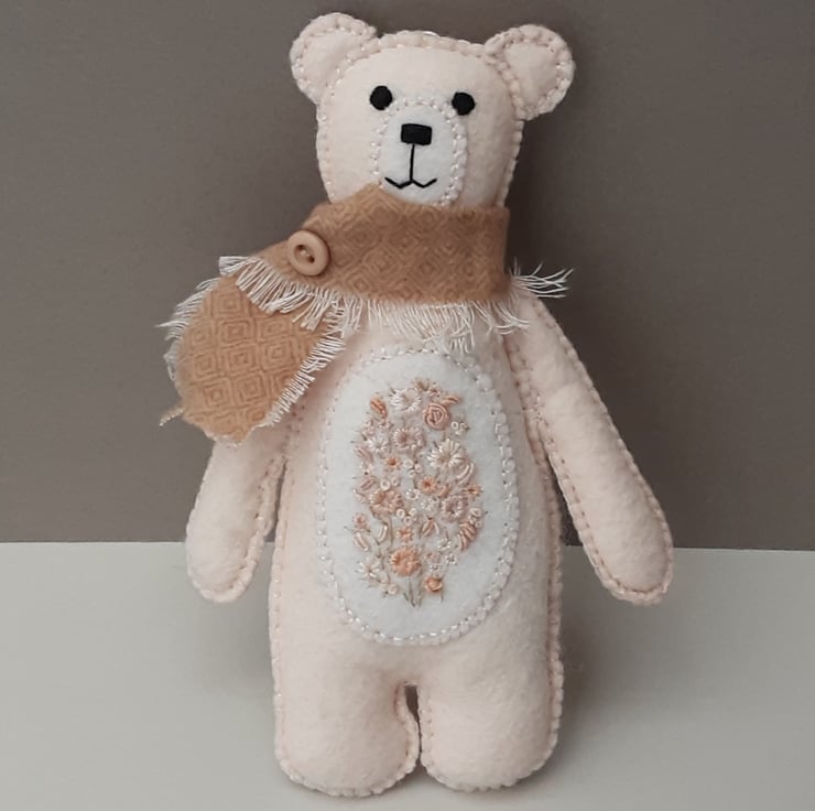 A unique design, 6.5" wool felt scandi style teddy bear, decorated with floral hand embroidery onto pale peach and ivory peach wool felt using soft peaches, naturals and pale salmon threads. Finished with a little torn fabric scarf and filled with super polyester filling and dried lavender for a gentle fragrance.