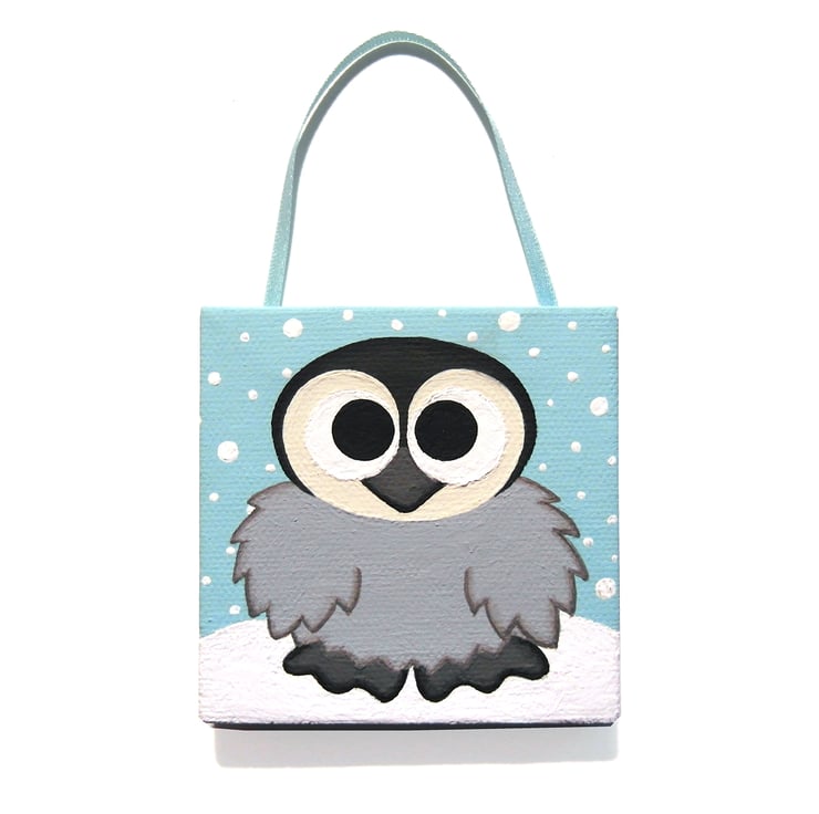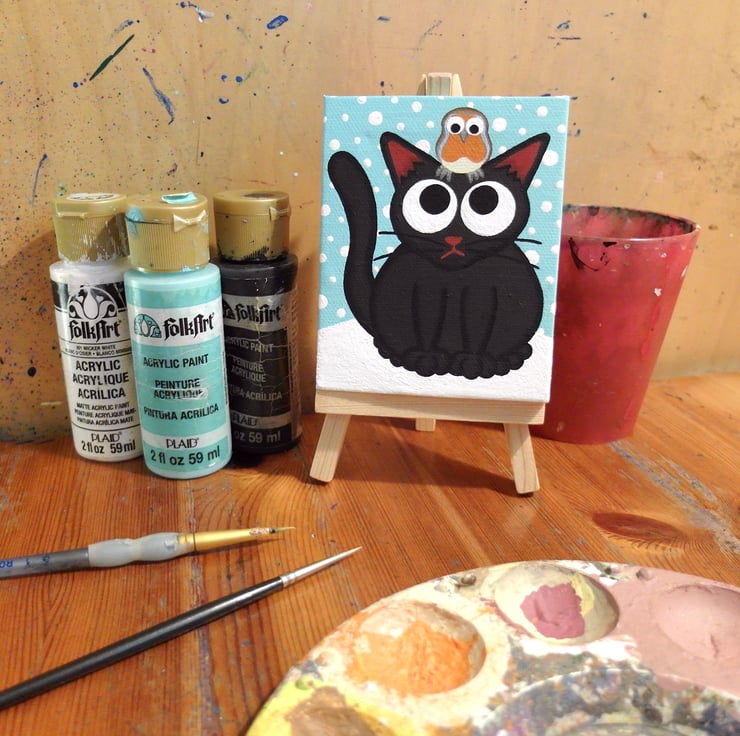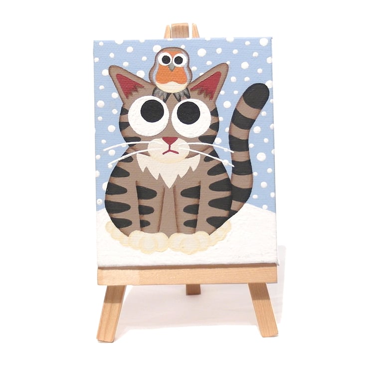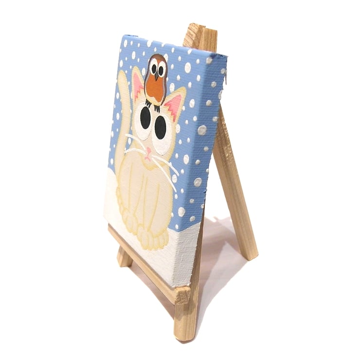 The cartoon cat will be painted in acrylics, looking at a robin that is perched on its head with a confused look. You will have a choice of either pale blue or pale turquoise for the sky colour, with falling snow. The cute winter scene will be painted on a mini 8cm x 10cm canvas. You will be able to choose if you'd like it to come with a miniature wooden easel (for display on flat surfaces), or if you prefer it to hang with a ribbon in a matching colour (as in the final photo).