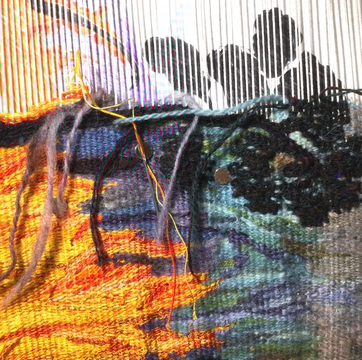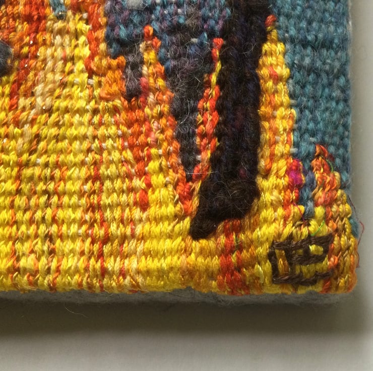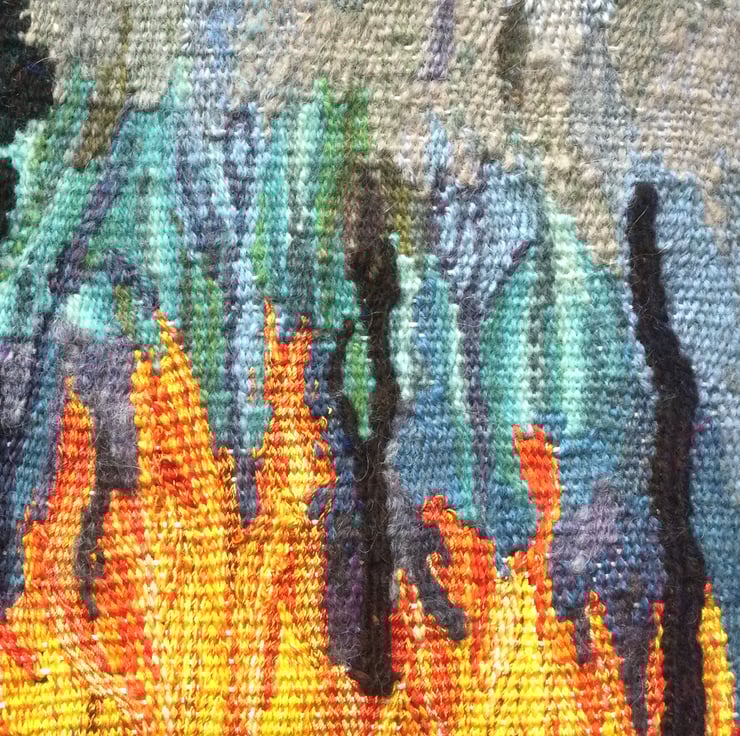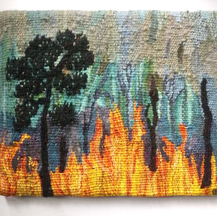 The Last Tree Standing is a one of a kind, mounted tapestry weaving which has been handwoven with a mixture of wools, cotton and rayon yarns including some of my hand spun and hand-dyed wool using lichen. It is woven in various shades of green, blue, grey, orange, yellow and red. I have used an eccentric weave technique to create the effect of the movement of the flames and I have used a soumak weave to create the tree trunks. I have used a random weave pattern to create the tree foliage and it was woven sideways on my Spinspired loom (see photo) It is stitched onto a piece of felt covered mdf which measures 24 x 20 x 2cm and hangs from d rings with twine.
