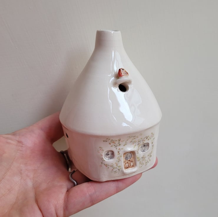 I threw this little house by hand on my potter's wheel then altered it to form the house shape, windows, and doors. The tiny robin red breast was hand modelled and perches over the attic window. Once dry it was bisque fired and hand painted before glaze application and the final firing.
