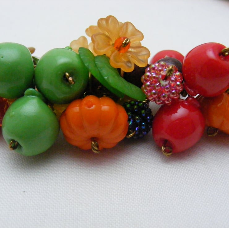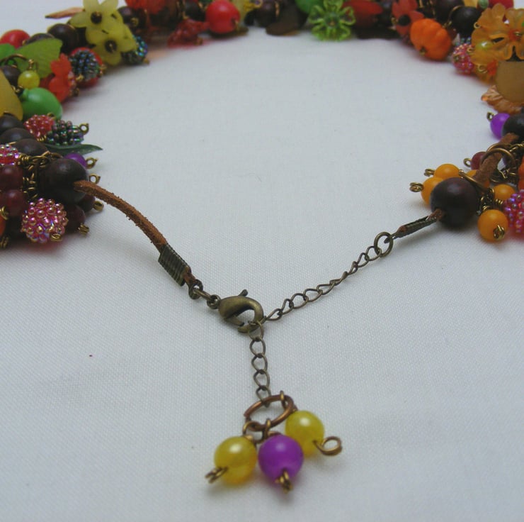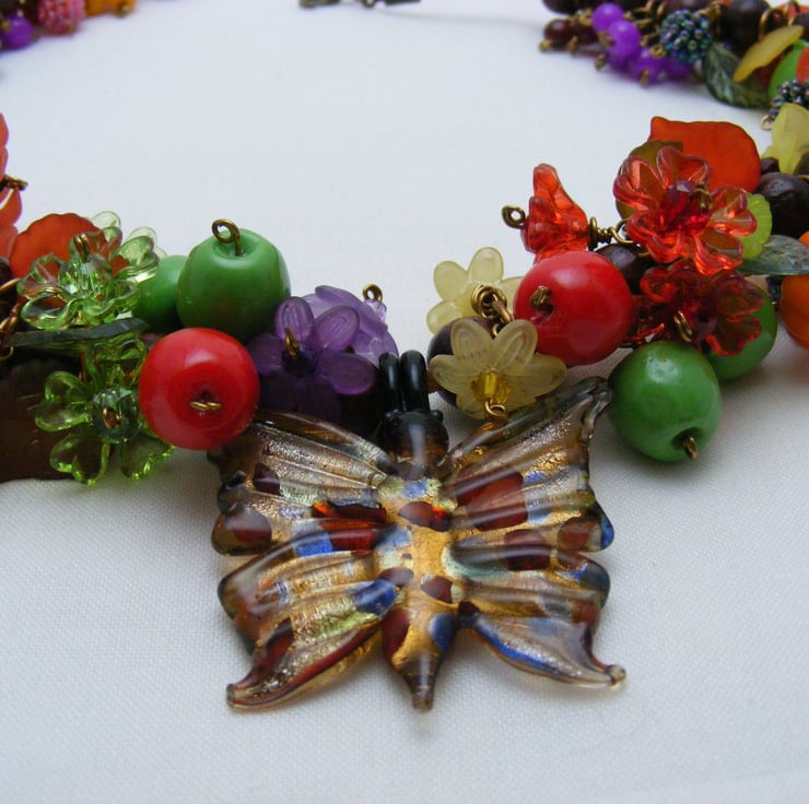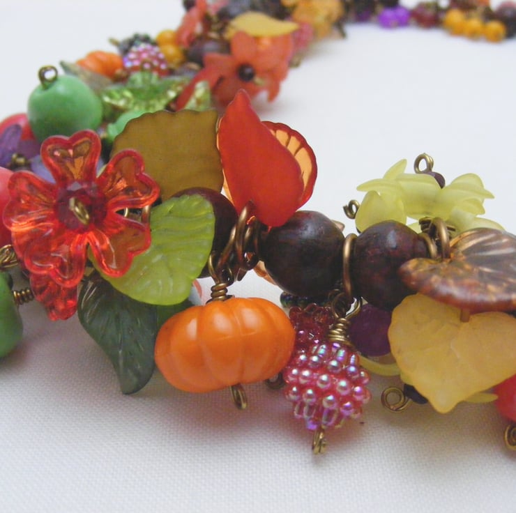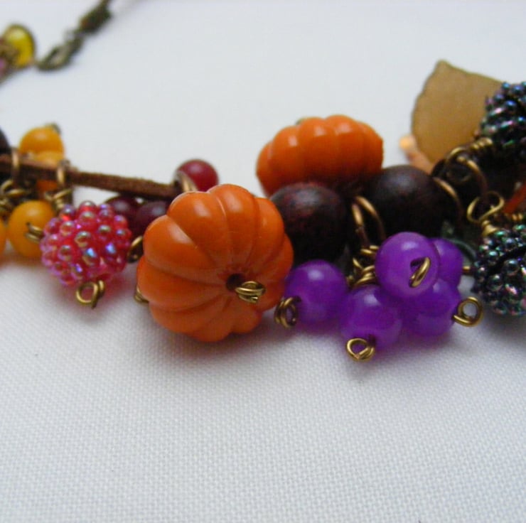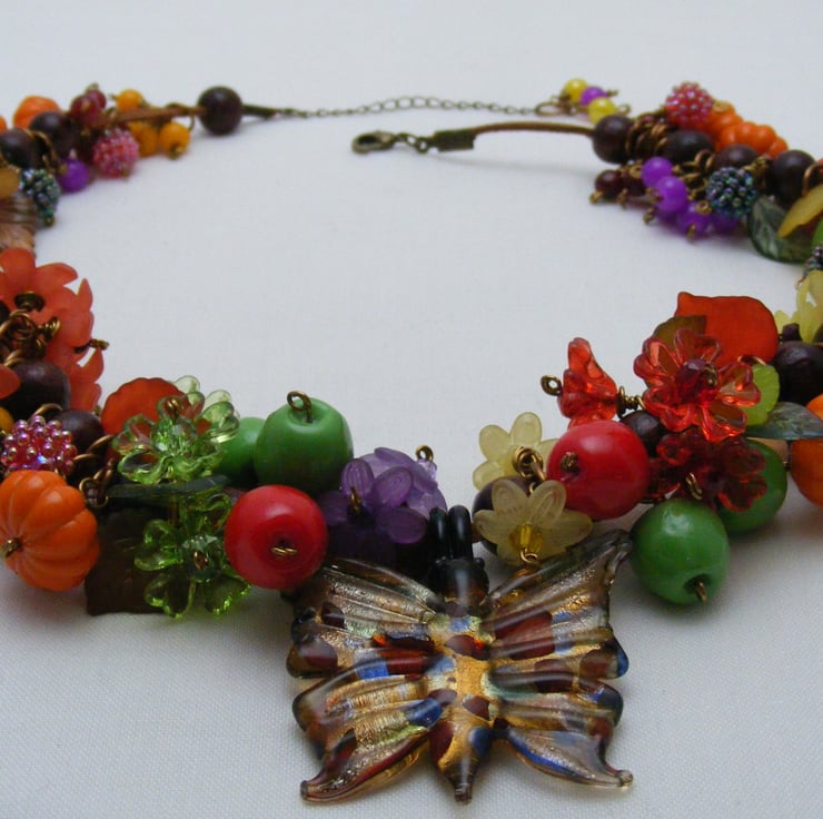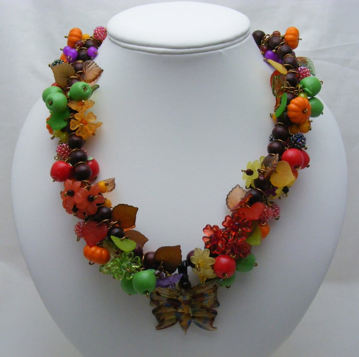 I've handmade this lovely, one of a kind autumnal necklace using, a 45x38mm glass butterfly pendant, 10mm brown wooden beads, 12mm red and green resin apples, 15mm orange resin pumpkins, 9mm black and red acrylic blackberry beads, 6mm red, yellow, orange and purple glass berries, 15mm orange, green and red lucite Crysanthemum flowers, 18mm red and yellow lucite sunflowers, 14mm red, yellow and purple lucite Dahali flowers, 12x15mm red, green, yellow, orange and brown lucite, leaves, 4mm brown, orange, purple, yellow and green Czech firepolish beads, 4x3mm red crystal rondelles, brown suedette and lobster claw clasp. Headpins and jump rings are handmade with antique bronze wire.
