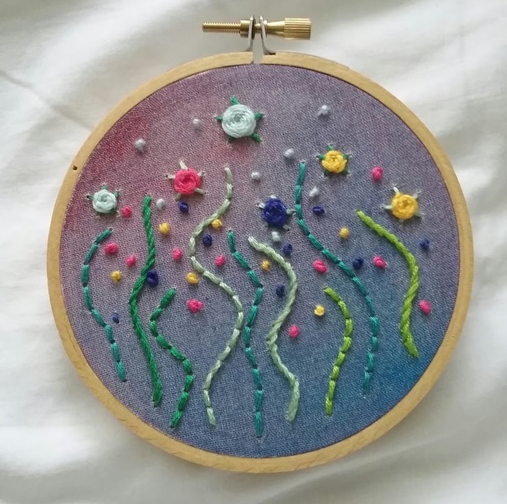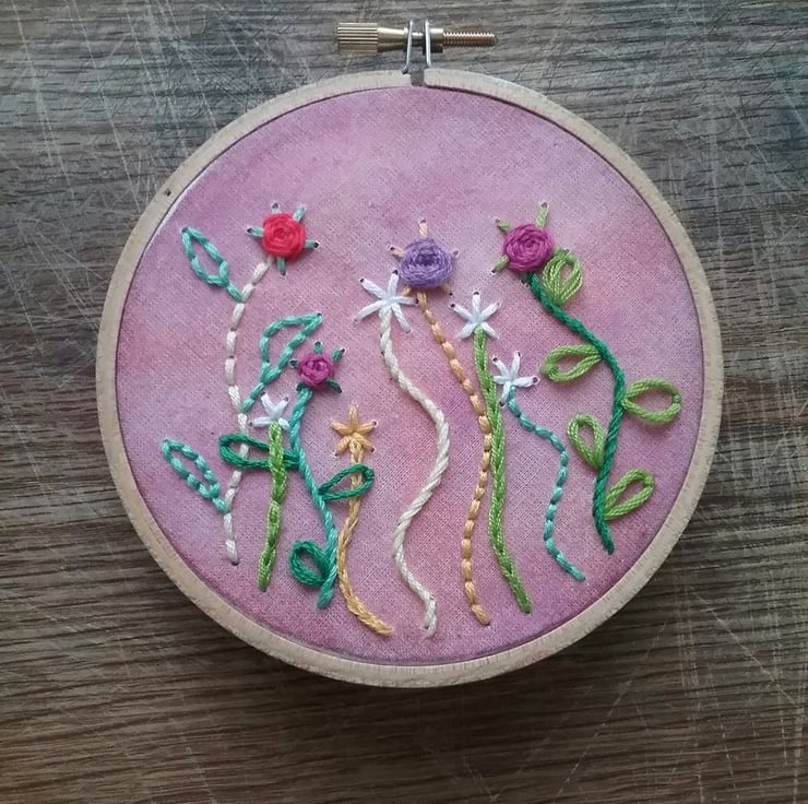 As a ready made completed hoop. Your embroidery piece has been hand stitched onto organic fabric and framed in a 4 inch bamboo hoop. It comes backed with felt and ready to display on your wall or on a shelf.