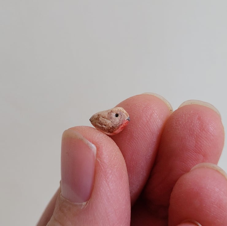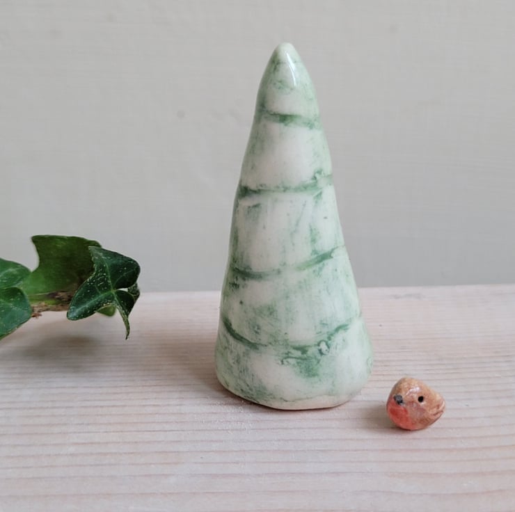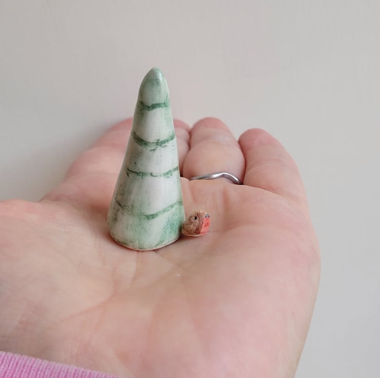 Tiny robin and miniature Christmas tree in white earthenware ceramic.