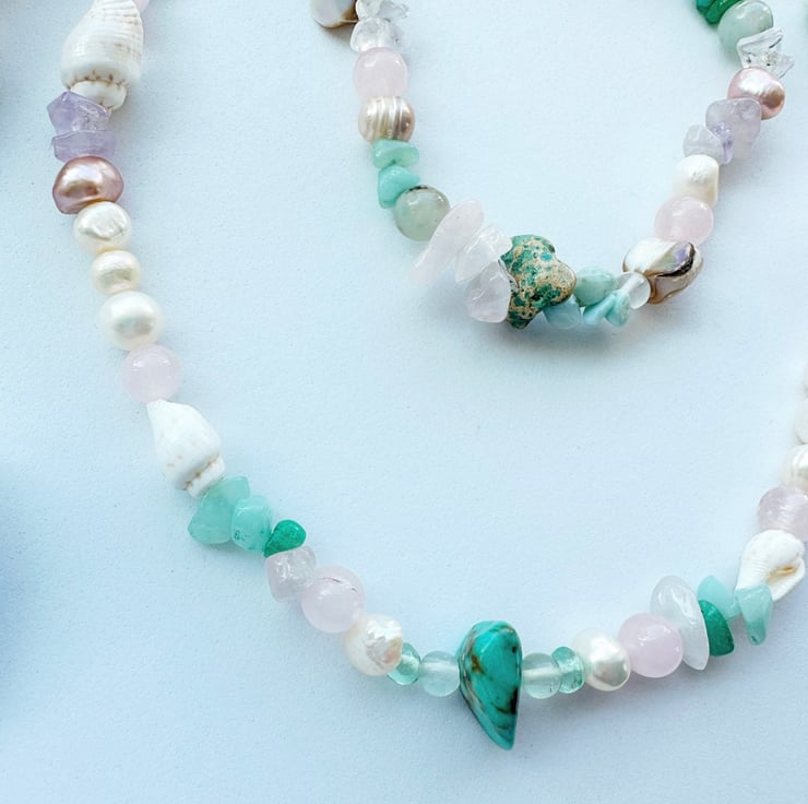 Delicate Handmade 16 inch Freshwater Pearl Crystal Bead Necklace with Larimar, Apatite, Rose Quartz, Turquoise Magnesite, Clear Quartz, Kiwi Jasper and a stainless steel silver toggle clasp with matching elastic bracelet.