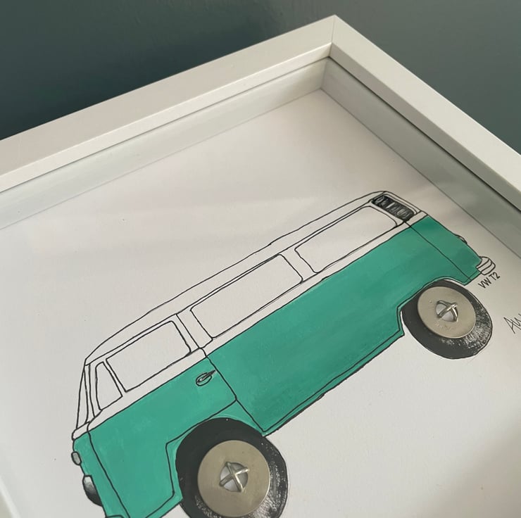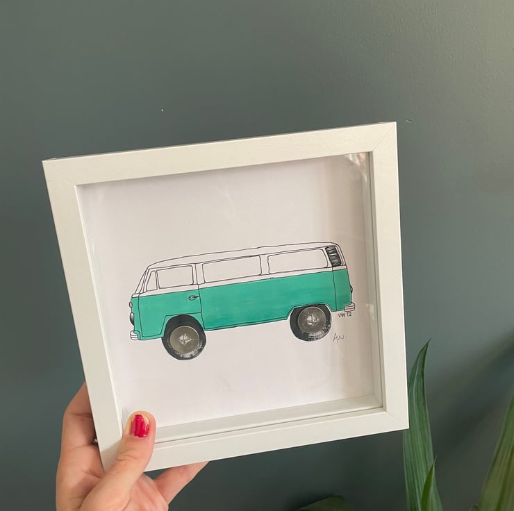 this is a hand-drawn and hand-painted T2 Camper van. Framed in a white box frame, measuring at 20 cm x 20 cm and 3 cm in depth. These are made to order, so may vary slightly, can offer model T1-6 and colour requests