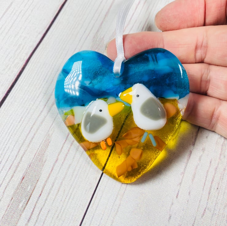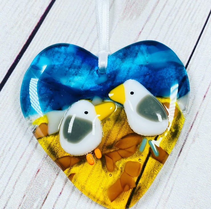 Gorgeous fused heart with quirky seagulls . All beautifully rounded and shiny. This glass heart would be a perfect bathroom decoration or gift for those seagull lovers. Approximately 4 inch diameter and 1/4 inch thickness. Drilled and strung with ribbon .