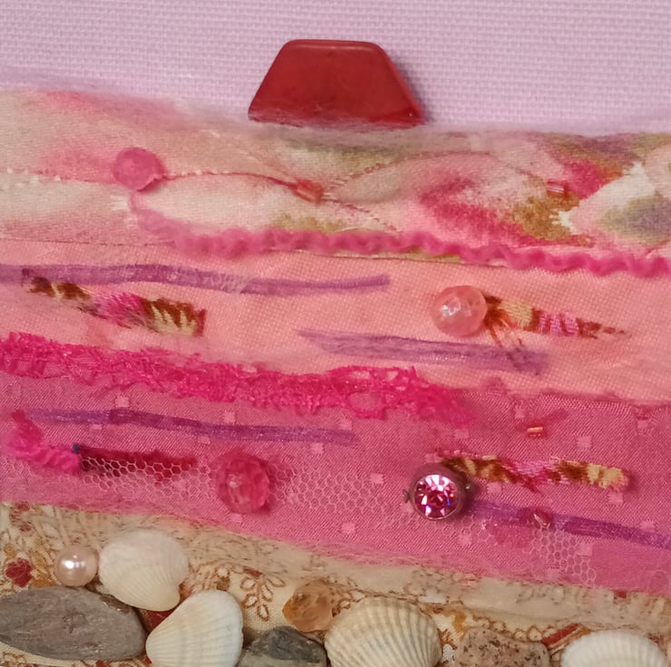 This piece is made in a blend of remnant fabrics, including some vintage floral fabric left over from a dress alteration. Beads add some sparkle to the sea with shells foraged from the beach.