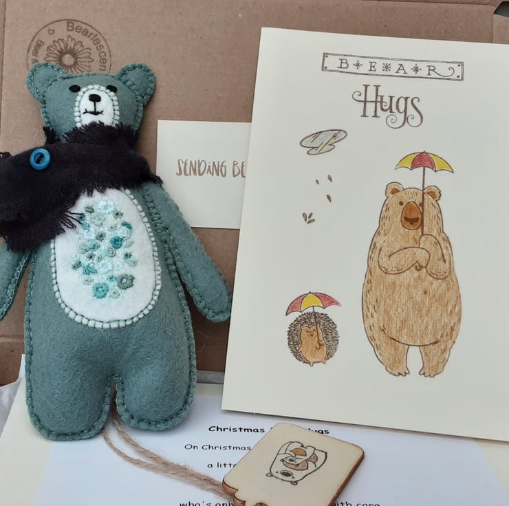 Teddy bear letterbox gift set. Hand sewn and embroidered unique Sending bear hugs gift that will fit through a letterbox.